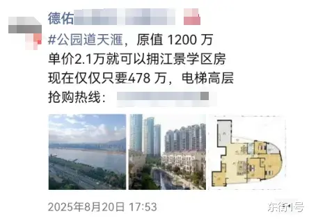 近日,福州不少中介都在推金山板块公园道天汇的同一套二手房源,227㎡看江大平层,原值1200万元,房东报价478万元,单价仅剩2.1万/㎡!听说价格还能谈。哪怕不算利息,仅账面本身就巨亏720万!