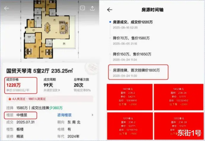 东街1號在贝壳找房平台上查询到,天汇去年5月成交的一套高楼层精装同户型,成交总价还有683万,一年时间就跌了将近三成!