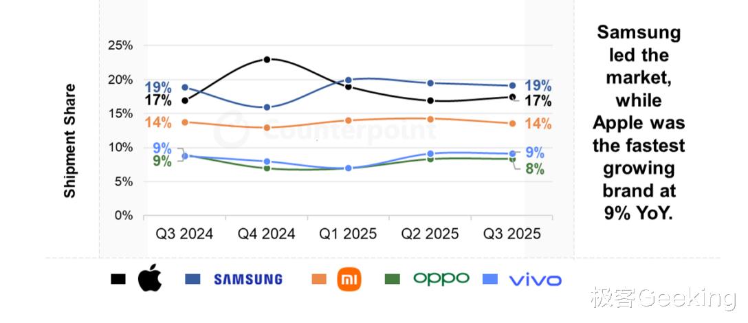 三星依然是全球最大的手机品牌,而在苹果市场份额持续增长的背景下,两者的差距越来越小,那么在第四季度,苹果将凭借 iPhone 17 系列的强势销量,很可能会超越三星,重回全球第一大手机品牌的地位。