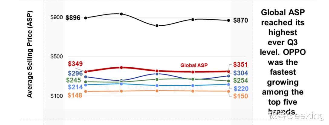 更重要的是,这次还同时公布了手机厂商的平均销售价格(ASP)数据,从市场大盘来看,全球平均销售价格达到了历史最高的第三季度水平,达到 351 美元,折合人民币是 2501 元。