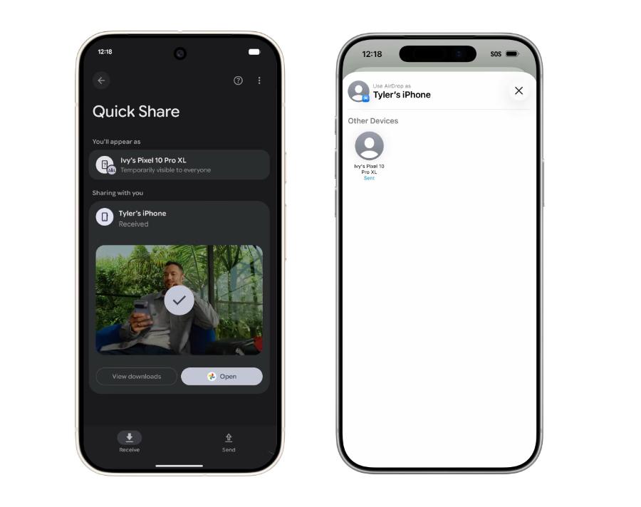 Pixel 10 系列机型用户已经可以在更新 Quick Share 组件后使用该功能。当向 iPhone 发送照片、视频或文件时,对方需要先把 AirDrop 的可见性设置为所有人(10 分钟),之后即可在分享界面看到 iPhone 的设备名称,直接点击发送即可。