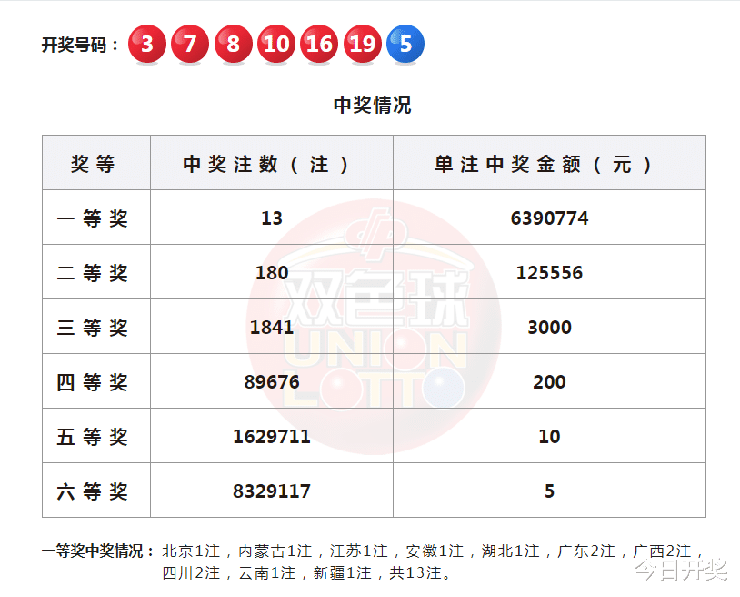 本期的双色球开出了13注的一等奖,单注奖金6390774元,一等奖中奖分布情况:北京1注,内蒙古1注,江苏1注,安徽1注,湖北1注,广东2注,广西2注,四川2注,云南1注,新疆1注,共13注分落在10个地区,其中的广东和广西以及四川个2注并列第一,这可是广西本月份的第二次上榜了,而且还上了榜首了,我们广西的彩民真是给力了,而从本期的销量来看,大概有个1.75亿注,双色球一等奖中奖概率是1772万分之一,那么本期有个10注左右是比较理想的,而实际开出了13注,实际注数比理论的注数偏少了很多了。