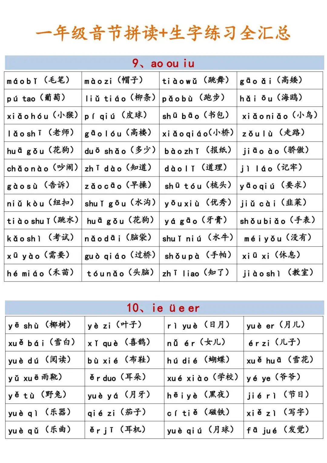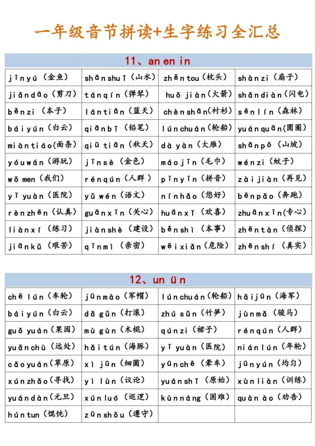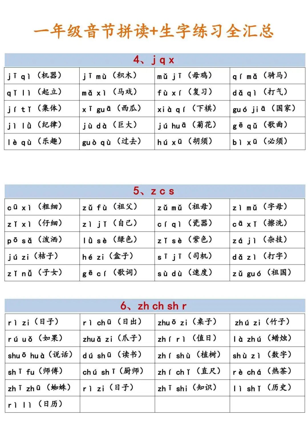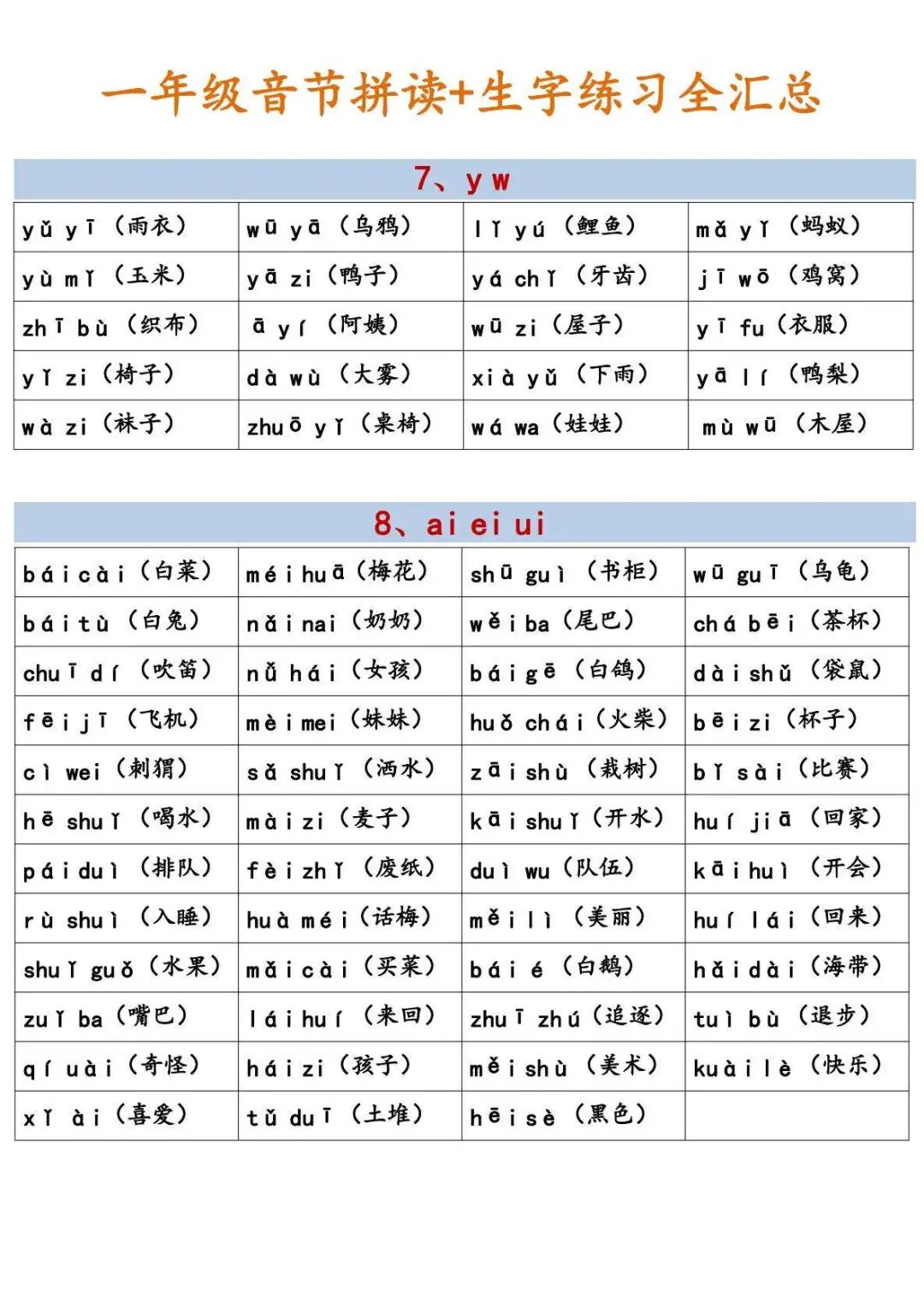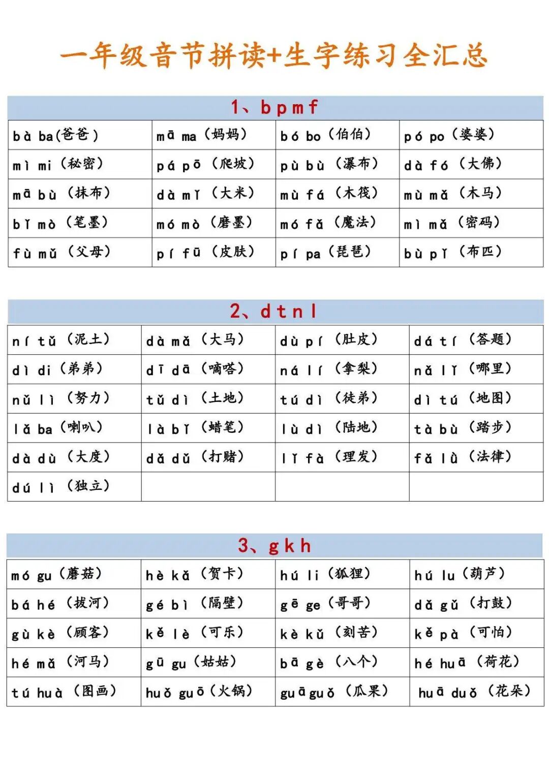 一年级的小朋友刚开始学拼音和生字,很多家长都头疼该怎么辅导。今天分享一份学习资料——一年级音节拼读和生字练习全汇总