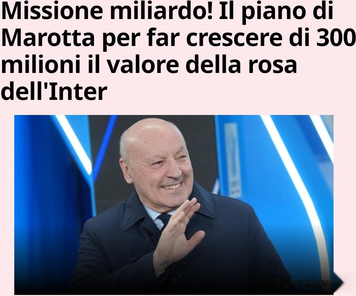 辞旧迎新之际,《米兰体育报》以“10亿欧元的使命”为题,指出:橡树资本给马洛塔的任务,是让国际米兰的价值——也就是球员的总价值提升3亿欧元,达到十位数欧元。