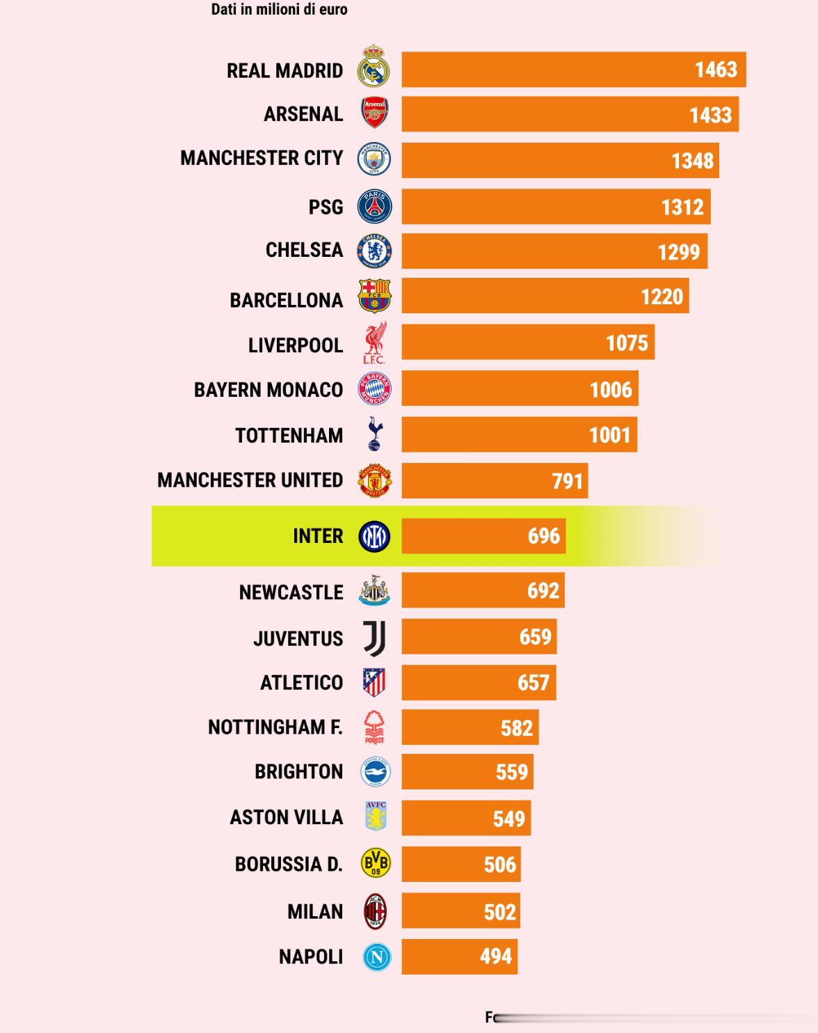 根据该机构12月的报告,国米目前的总价值是6.96亿欧元,7亿左右,是意甲第一,位列欧洲第11位。
