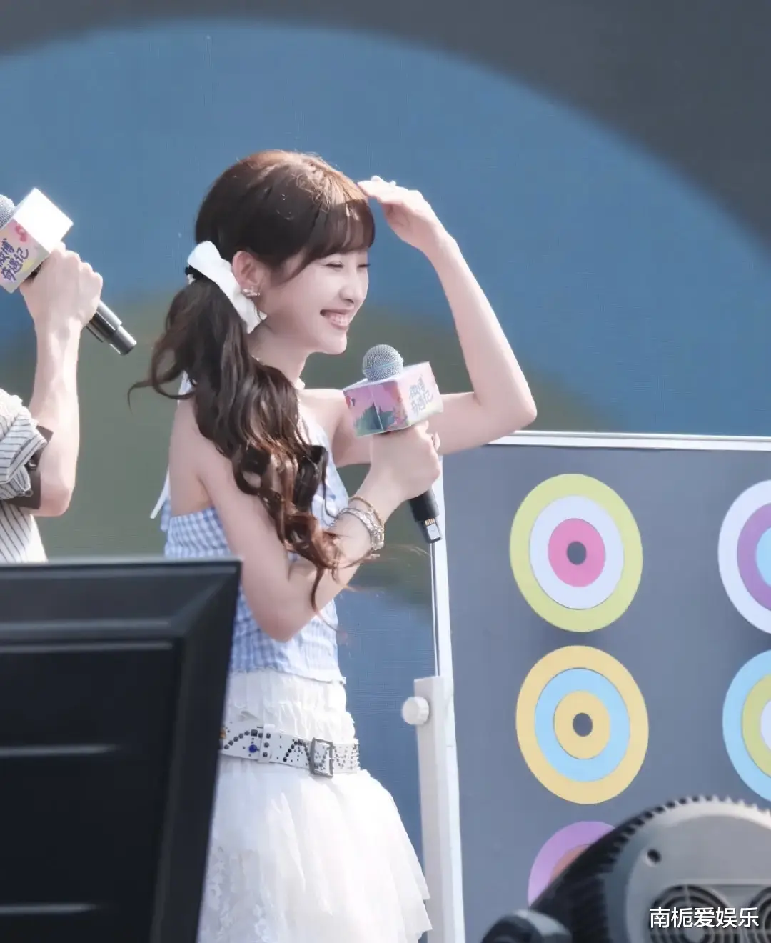 活动当天,许梦圆一登场便引来全场瞩目。没有夸张的妆容,也没有繁复的配饰,她仅以低饱和度的蓝白配色与简约剪裁,就还原了《流星花园》中杉菜的棉麻学院风与《恶作剧之吻》里袁湘琴的校园少女感。单边马尾随步伐轻晃,白色蛋糕裙在微风中轻轻扬起,她低头浅笑的瞬间,仿佛连空气都变得甜腻起来。网友纷纷感叹:“她不是在走红毯,是在发糖!”“连发丝都在演偶像剧。”