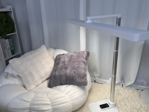 它采用旋钮式控制,将开关、亮度和模式整合在一起,操作逻辑清晰,也避免了触控误触的问题。双转轴灯臂支持多角度调节,适配不同坐姿和桌面高度。