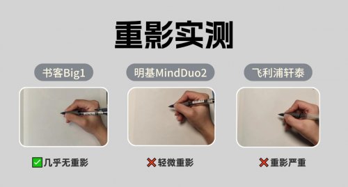 明基MindDuo2存在轻微重影,尤其在手部遮挡时更为明显;飞利浦轩泰采用的是直发光设计,光线比较集中,重影问题最为突出,笔尖和文字边缘容易出现双影,长时间书写更容易产生视觉疲劳。