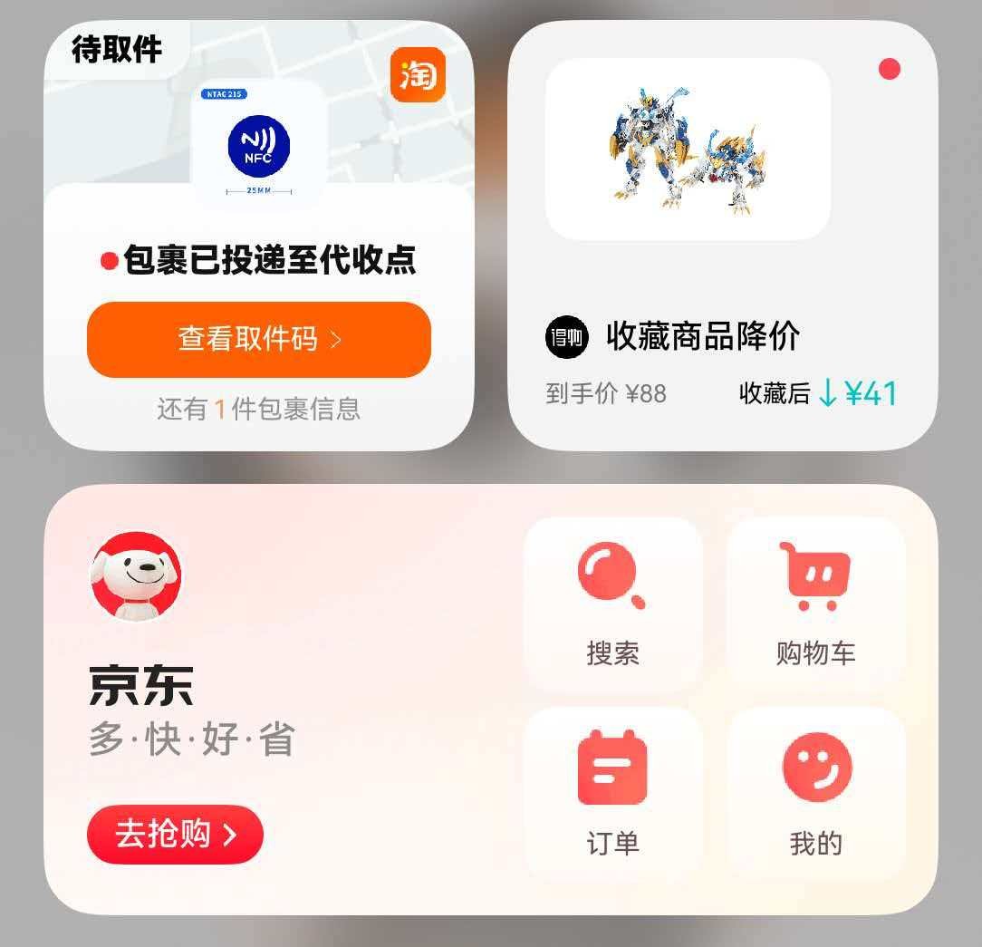 另外,双11期间,我还把淘宝、得物、京东这几个常用的购物软件的“服务卡片”也添加到了负一屏,方便我随时比价、查看购物车,真正做到了“高效剁手”。