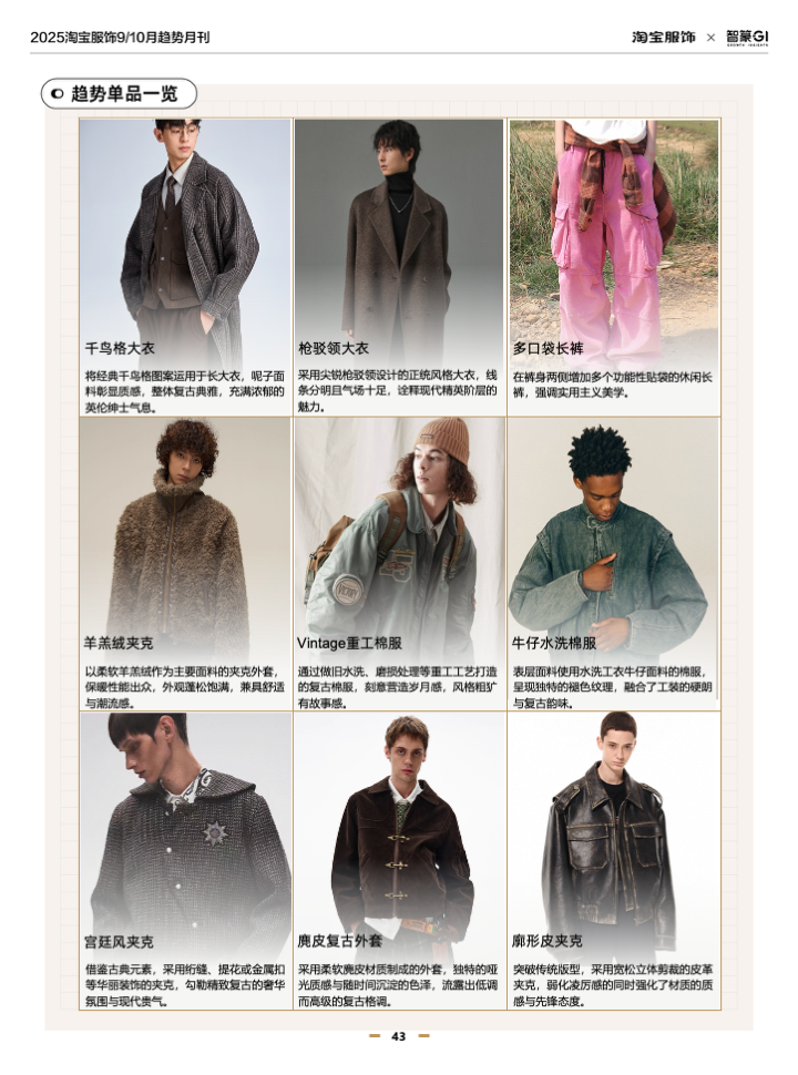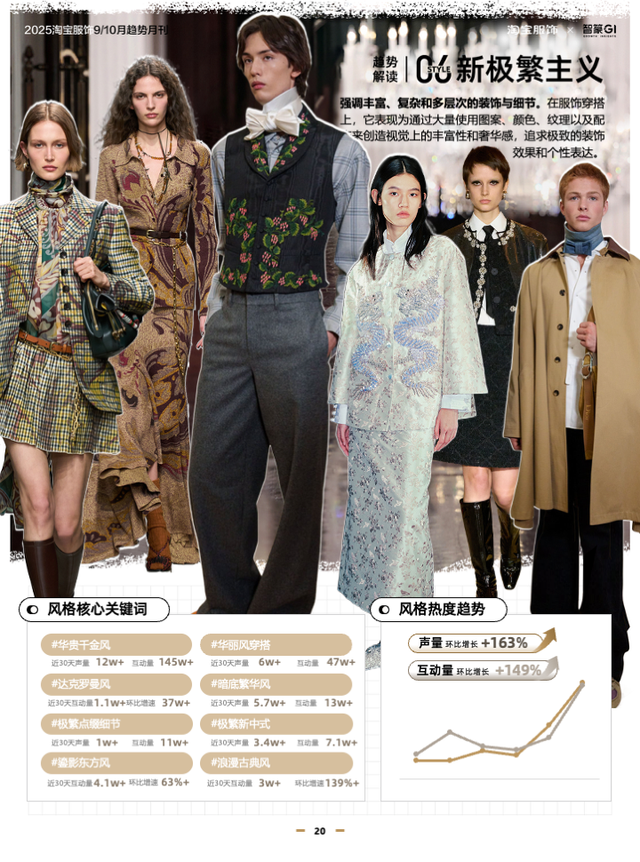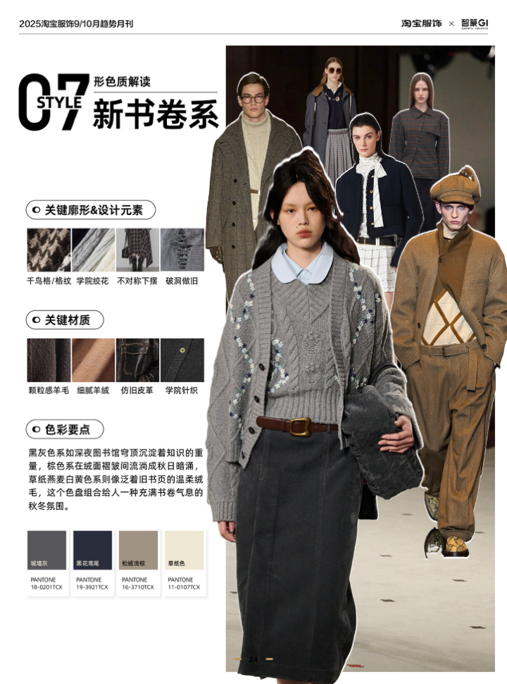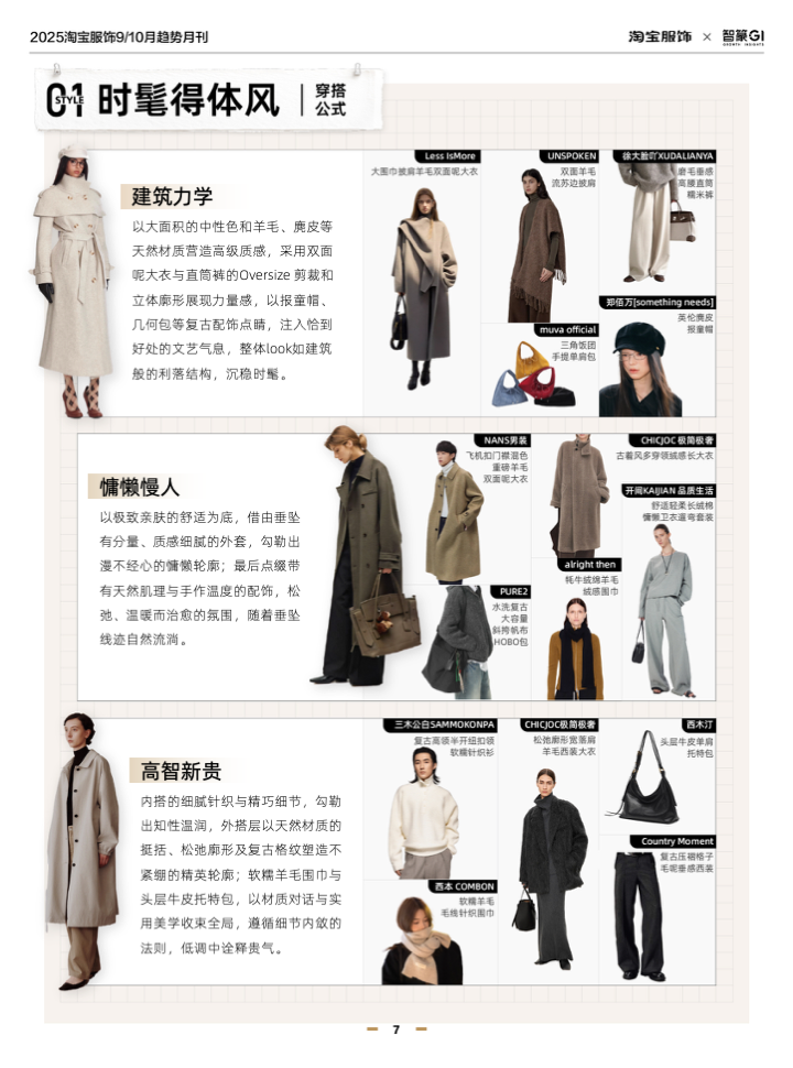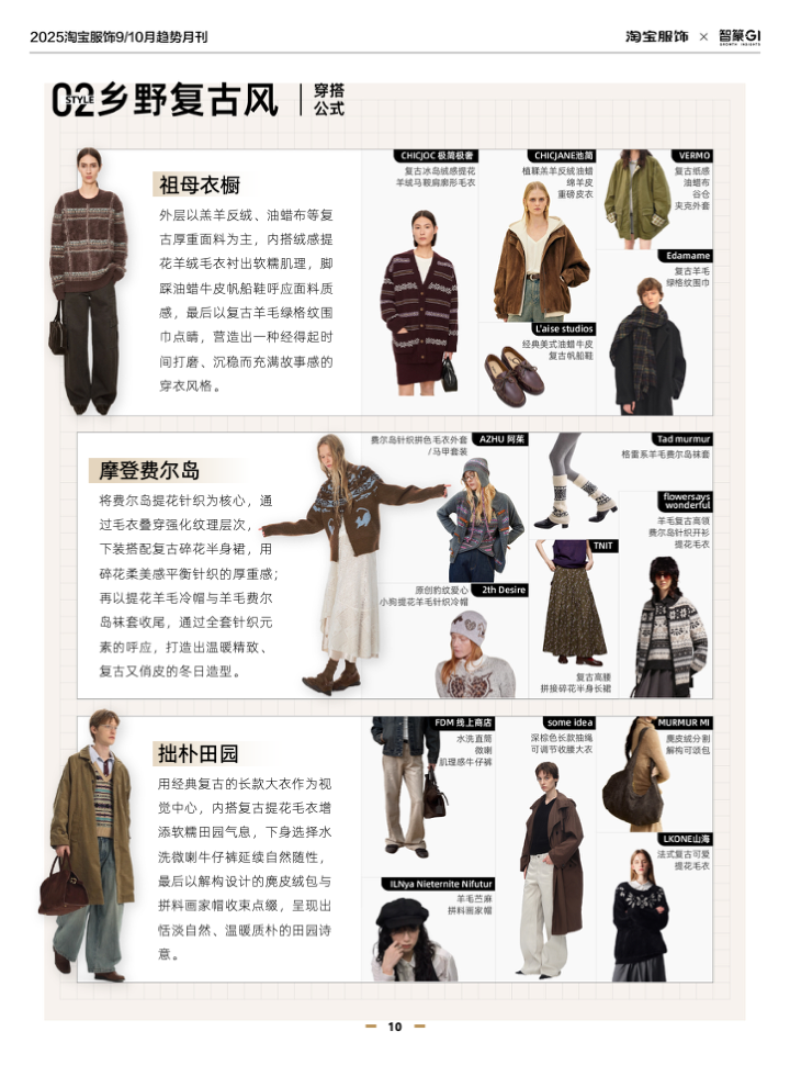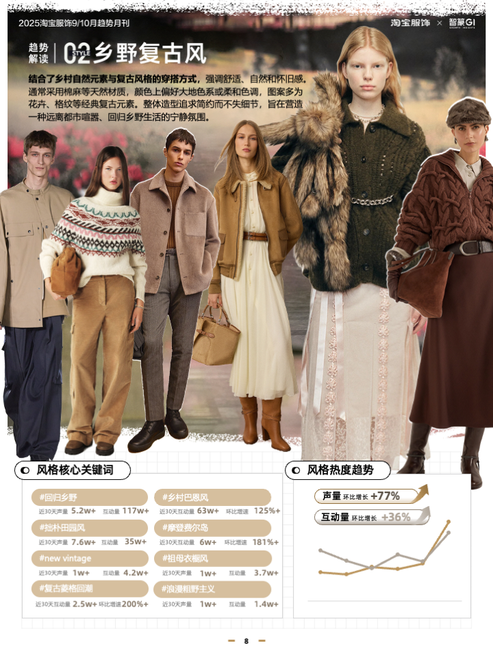 从职场干练到旷野自由,定义秋冬穿搭美学新范式金秋时节的9/10月,穿搭风格逐渐向质感与层次感靠拢,选择更加多元;其中,职场日常穿搭以简约设计为主流,如时髦得体风、新书卷系;乡野复古风、东欧游牧风和疗愈松绒系中的自然舒适元素,为秋日穿搭注入治愈时尚感;此外,新极繁主义、复古甜心风和朋克千禧风凭借对复杂美学的探索与怀旧元素的融合,为个性化表达提供了更多选择。