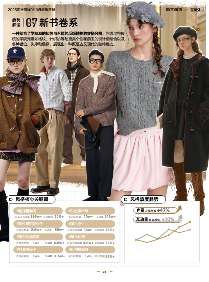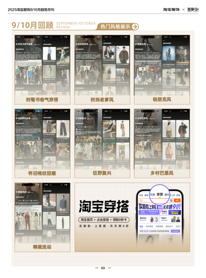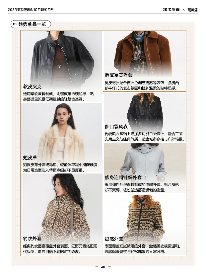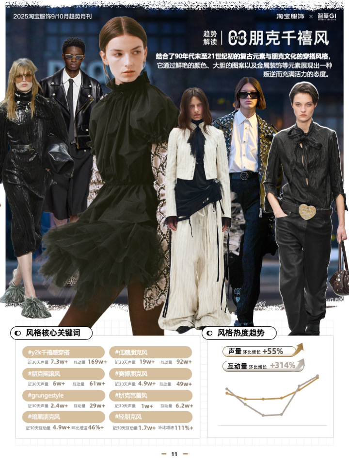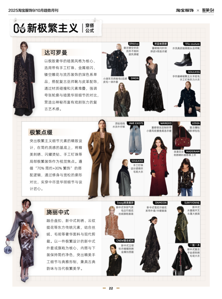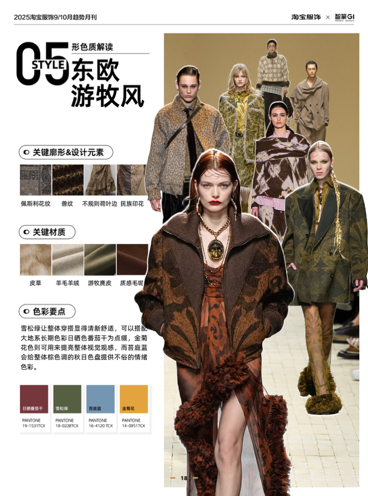 从职场干练到旷野自由,定义秋冬穿搭美学新范式金秋时节的9/10月,穿搭风格逐渐向质感与层次感靠拢,选择更加多元;其中,职场日常穿搭以简约设计为主流,如时髦得体风、新书卷系;乡野复古风、东欧游牧风和疗愈松绒系中的自然舒适元素,为秋日穿搭注入治愈时尚感;此外,新极繁主义、复古甜心风和朋克千禧风凭借对复杂美学的探索与怀旧元素的融合,为个性化表达提供了更多选择。