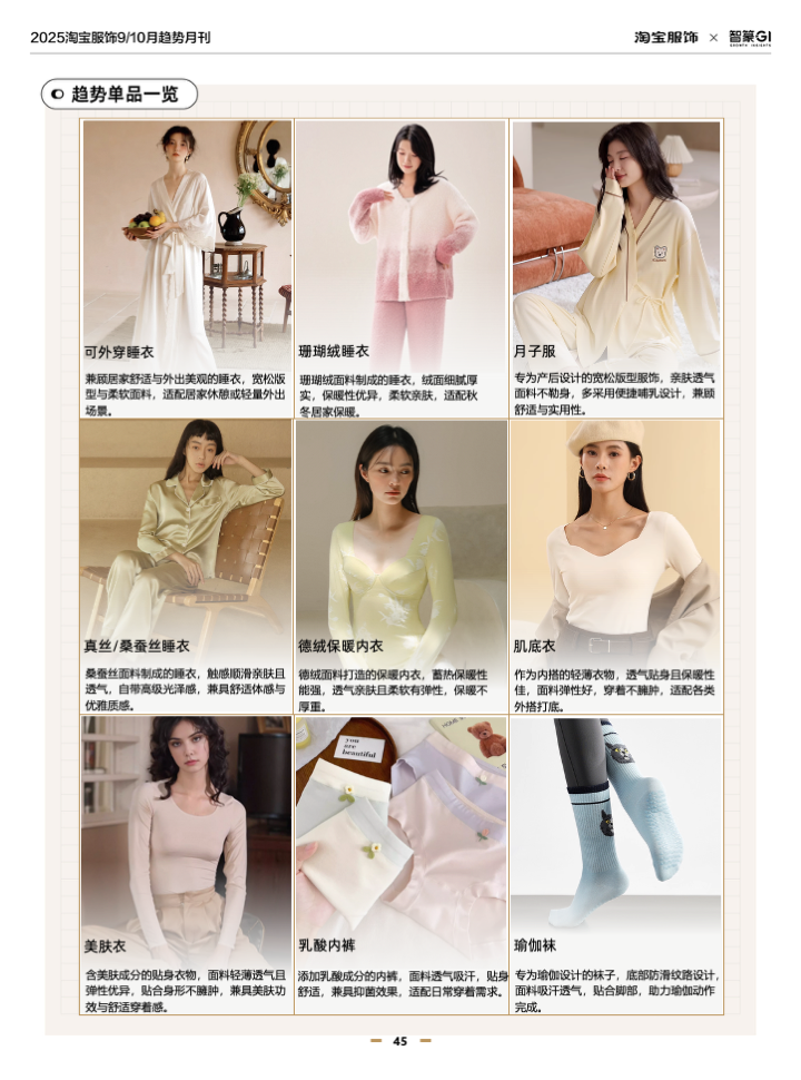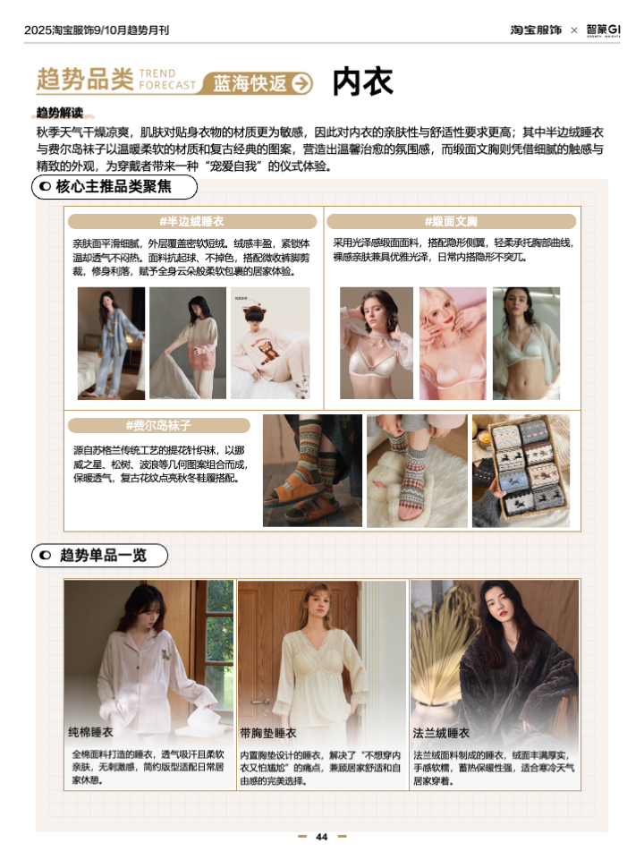 从厚重保暖到场景化创新,挖掘秋冬服饰增长点报告结合热度指数与成交数据,归纳行业核心主推品类及趋势蓝海快反机会点:9/10 月气温逐步下降,消费者衣柜中的衣物也随之向厚重款过渡,毛针织衫、卫衣绒衫、休闲裤等成主力品类,毛呢外套、皮草、棉衣等保暖型单品销量增速也明显上升。今秋服装消费的时尚属性愈发凸显,皮草、皮衣、马丁靴、时装靴等时装消费趋势显著。同时,内衣与服饰配饰中家居服、连裤袜/打底袜等品类关注度快速提升。