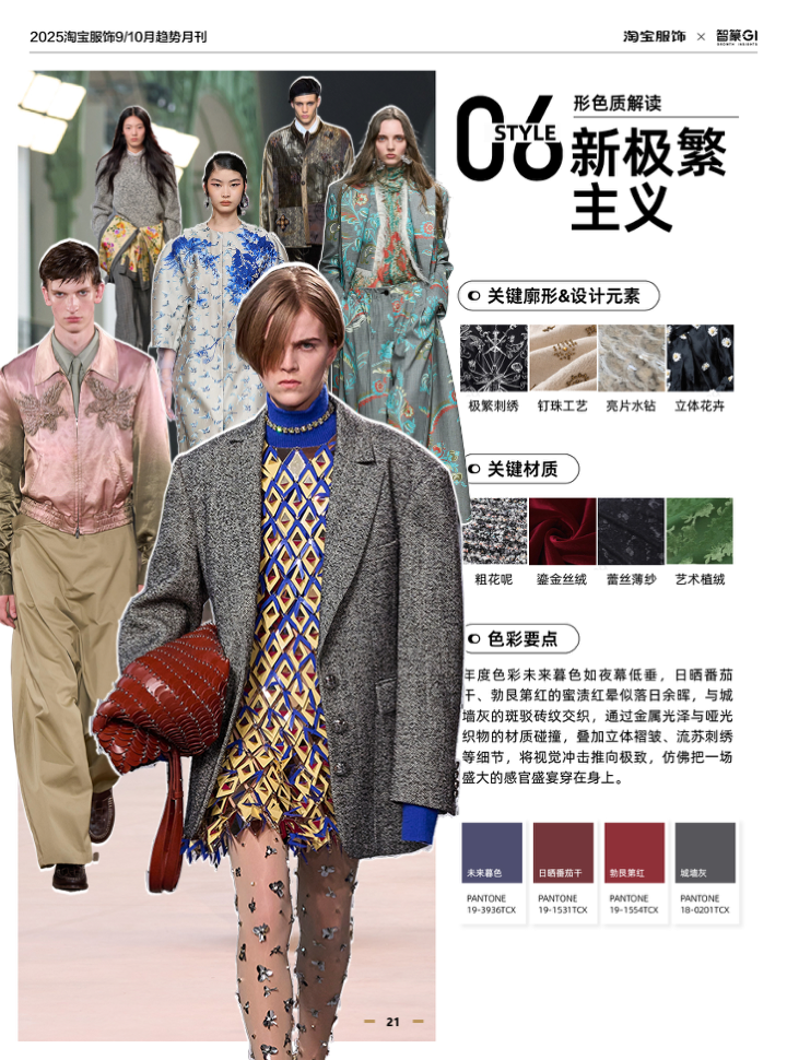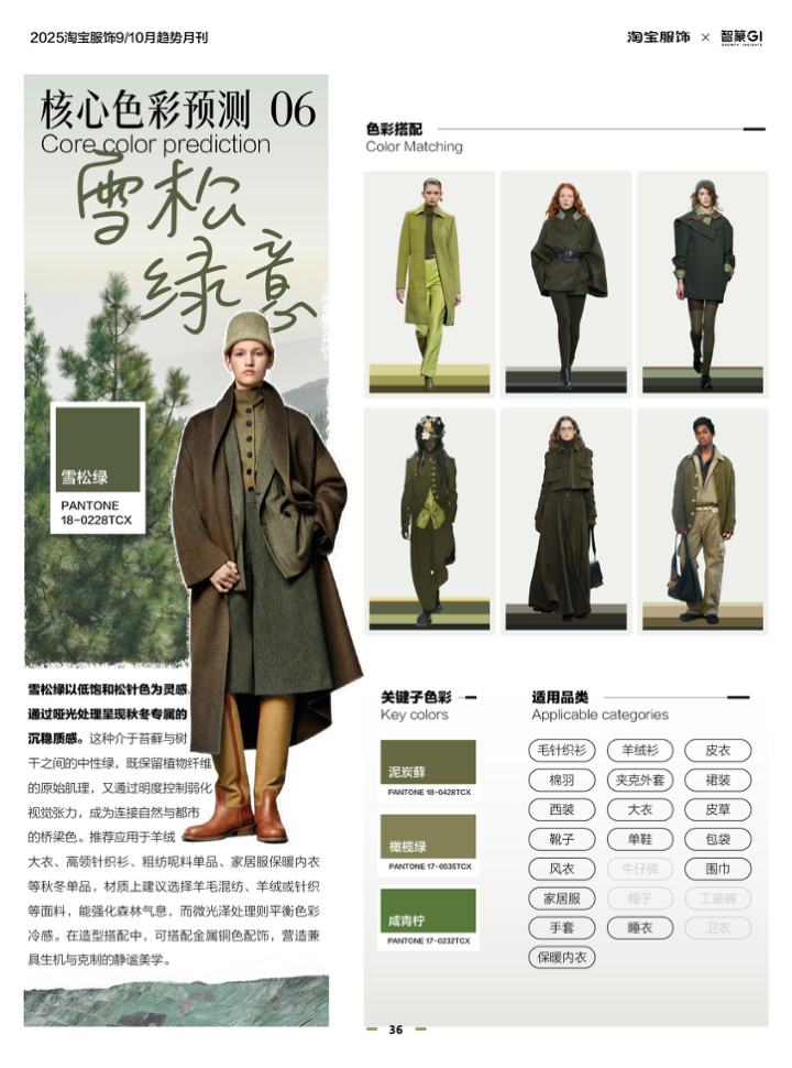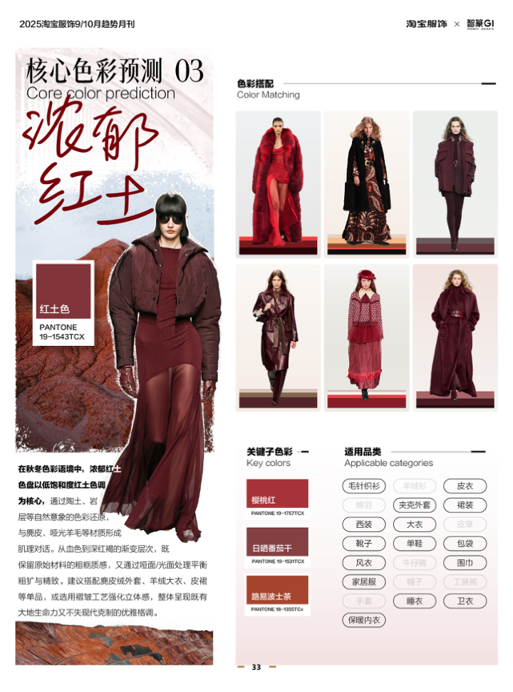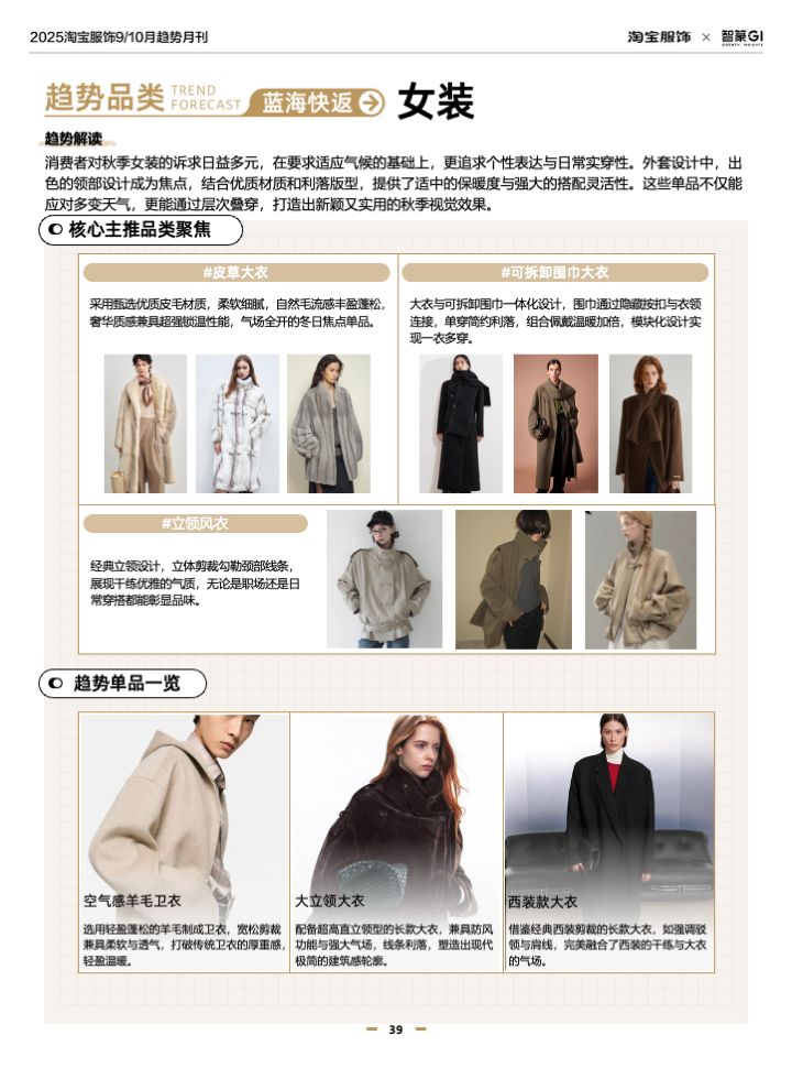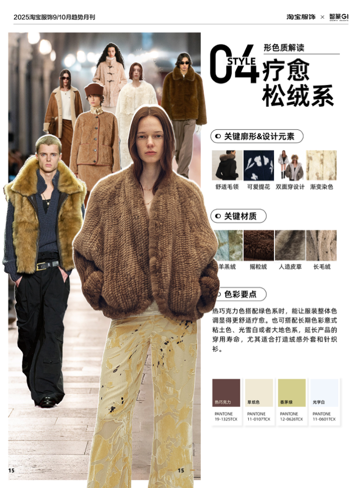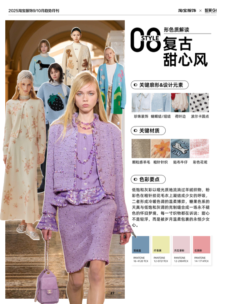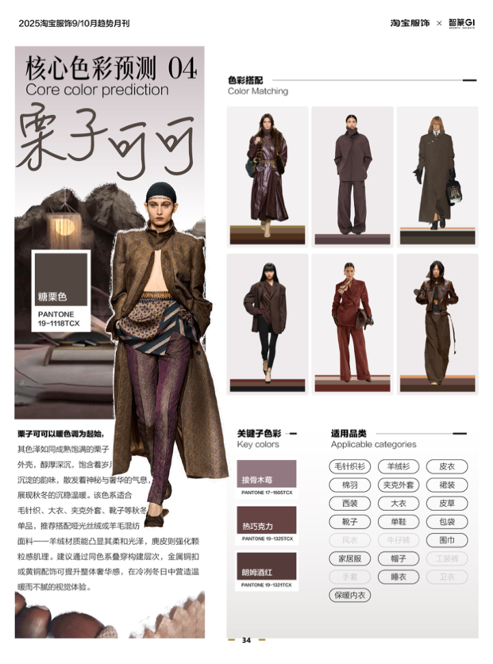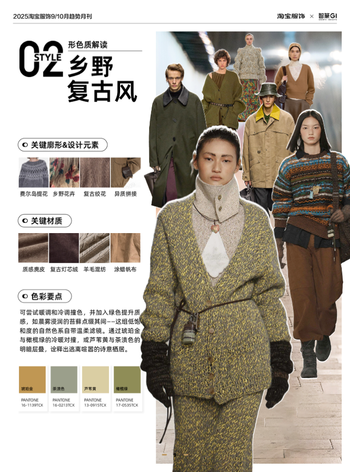 淘宝服饰联合智篆正式发布《淘宝服饰趋势洞察9/10月刊》,聚焦冬上新核心节点,提炼出「时髦得体风」「朋克千禧风」「乡野复古风」「疗愈松绒系」「东欧游牧风」「新极繁主义」「新书卷系」「复古甜心风」八大核心趋势风格,预测「琥珀流光」「苔庭雾蓝」「浓郁红土」「栗子可可」「原色草纸」「雪松绿意」六大核心趋势色彩,归纳各服饰类目热门趋势品类,为行业商家提供秋冬消费趋势预判与选品策略,助力精准把握黄金销售窗口。