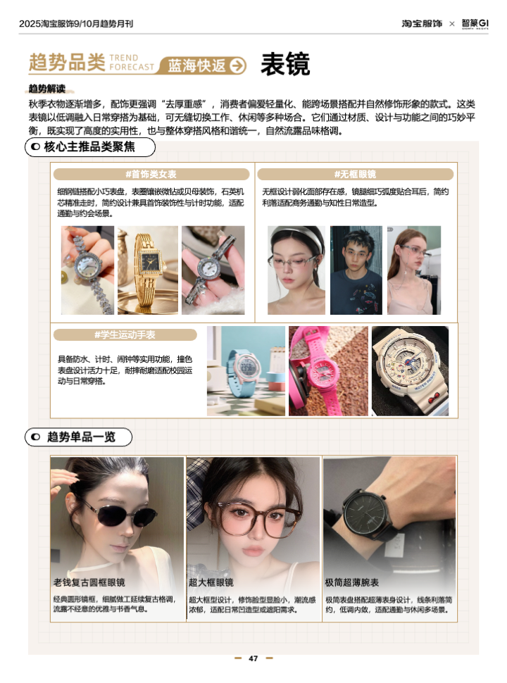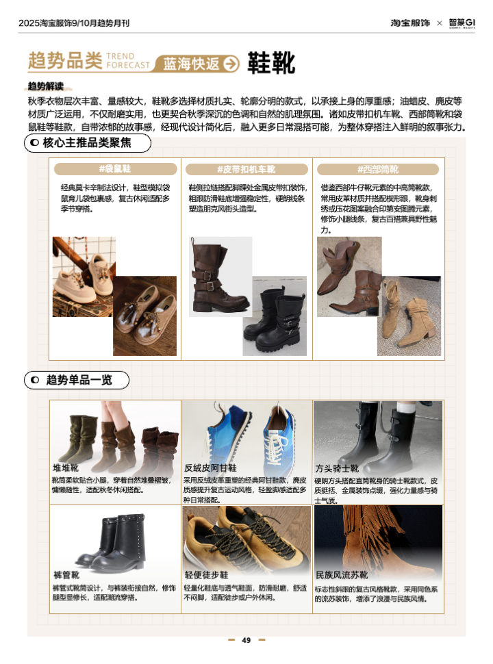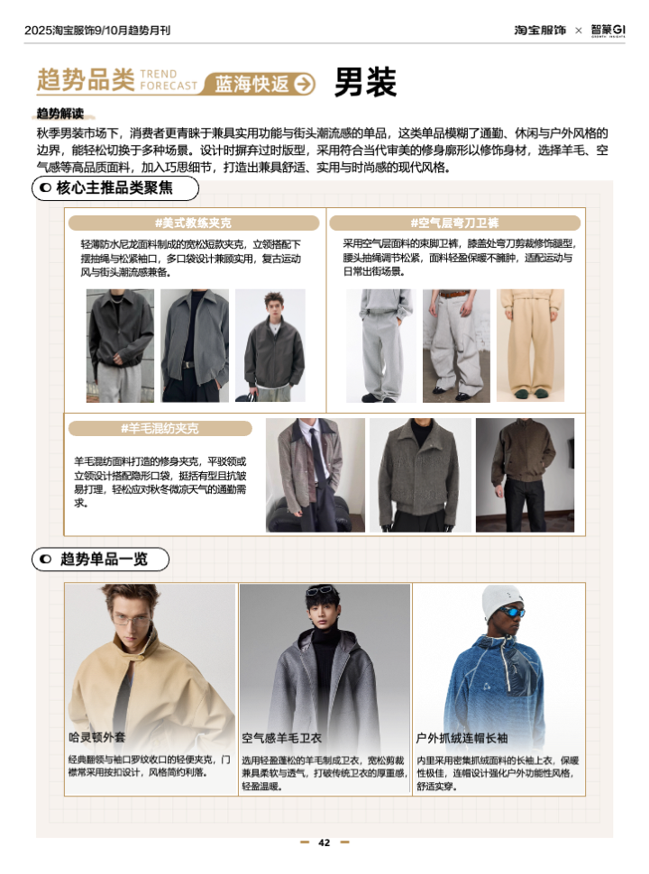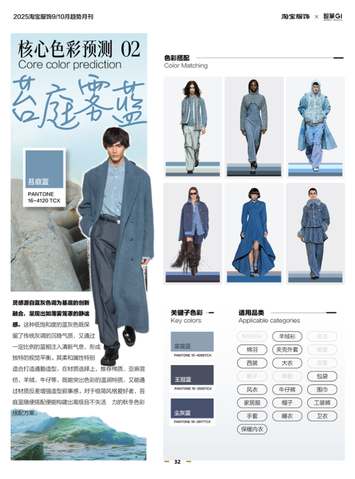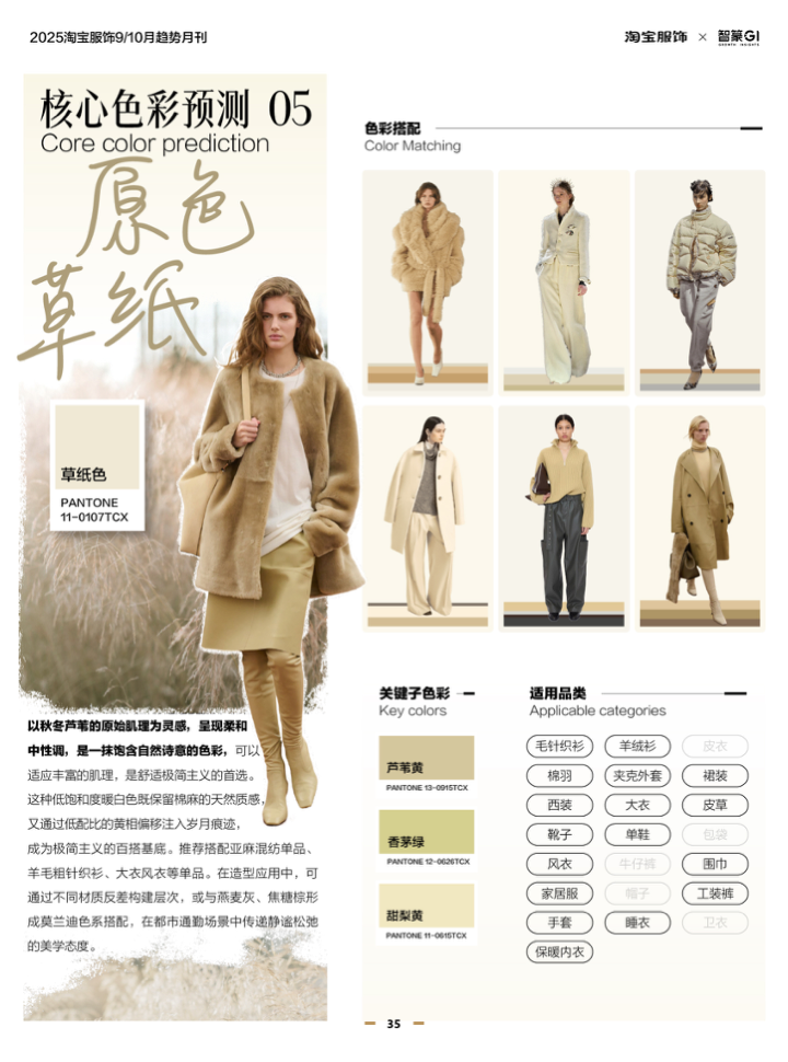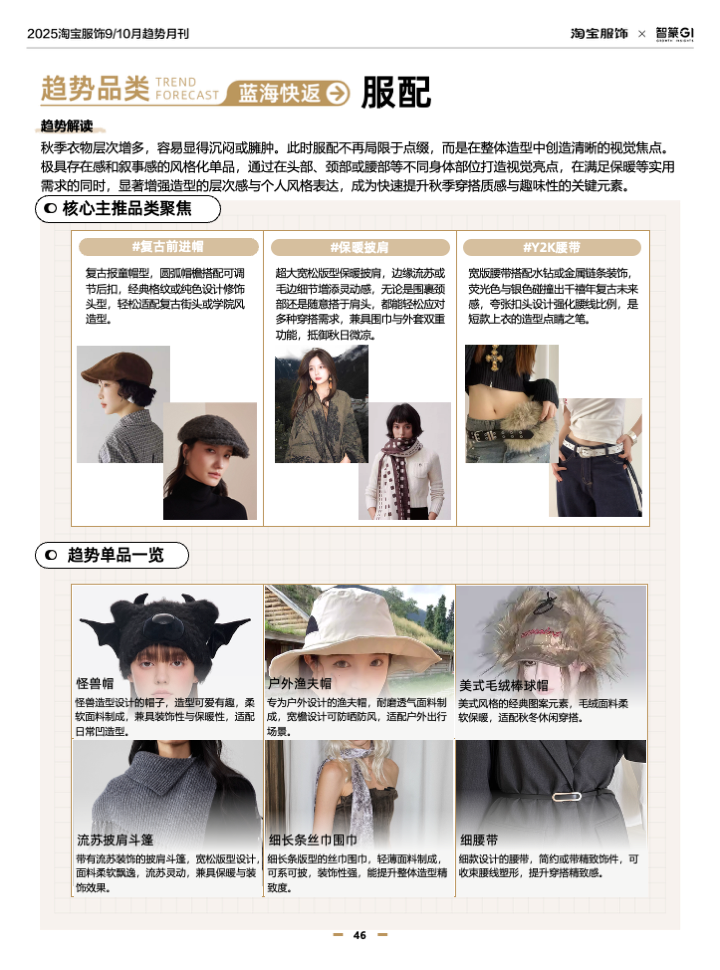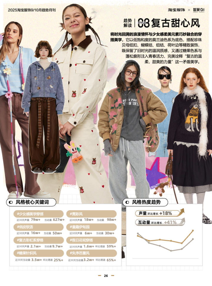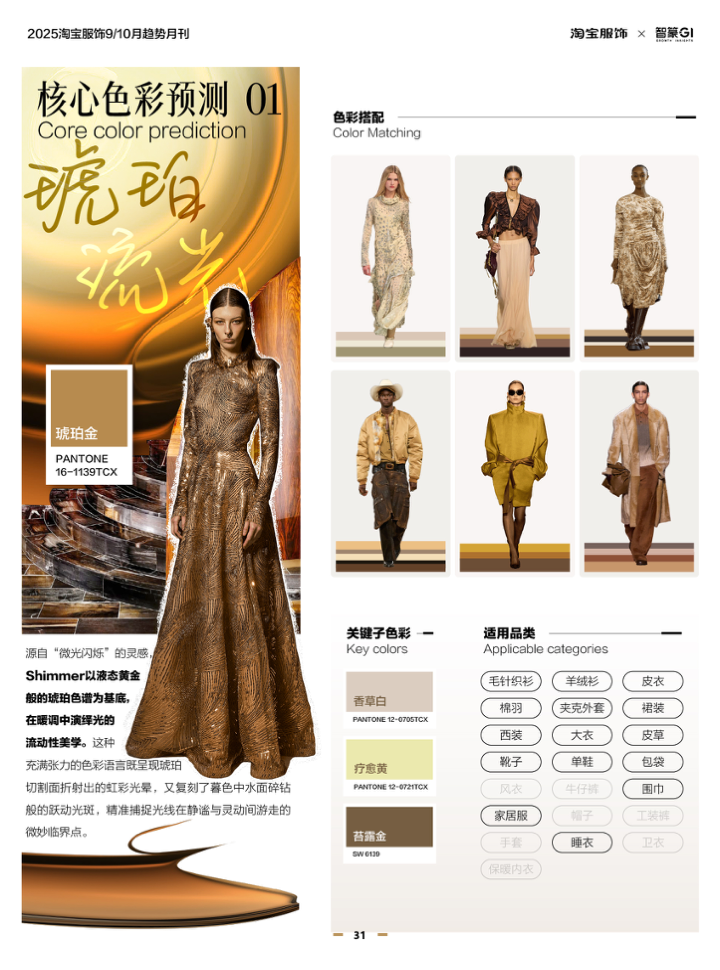 淘宝服饰联合智篆正式发布《淘宝服饰趋势洞察9/10月刊》,聚焦冬上新核心节点,提炼出「时髦得体风」「朋克千禧风」「乡野复古风」「疗愈松绒系」「东欧游牧风」「新极繁主义」「新书卷系」「复古甜心风」八大核心趋势风格,预测「琥珀流光」「苔庭雾蓝」「浓郁红土」「栗子可可」「原色草纸」「雪松绿意」六大核心趋势色彩,归纳各服饰类目热门趋势品类,为行业商家提供秋冬消费趋势预判与选品策略,助力精准把握黄金销售窗口。
