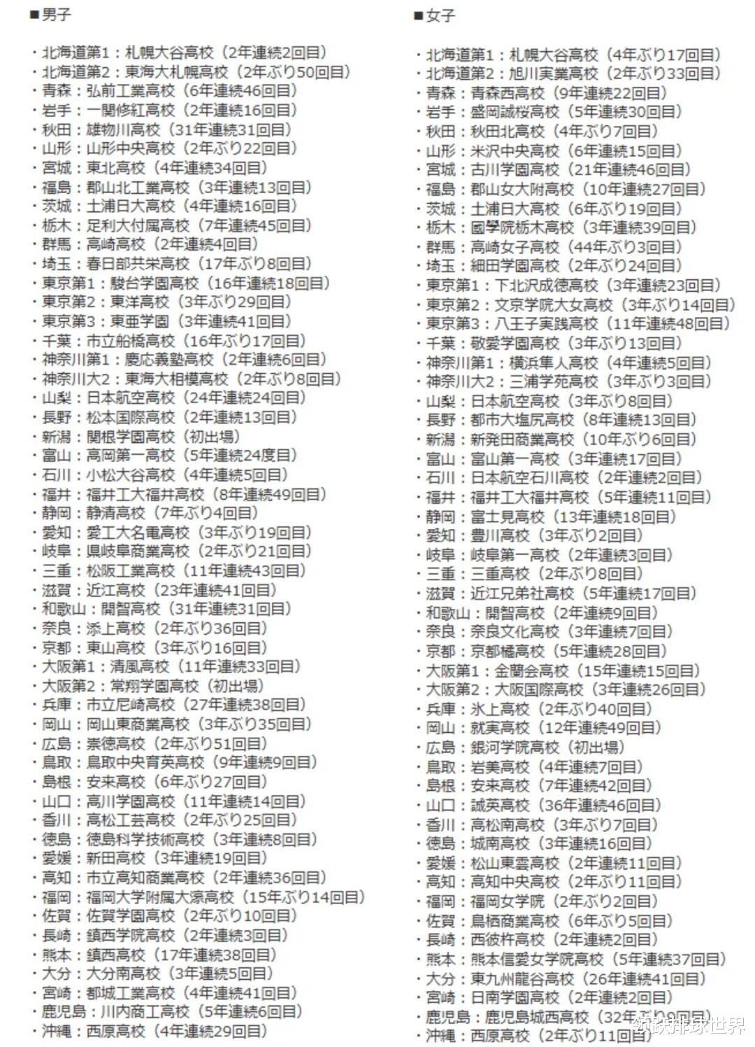 尤其值得注意的是,部分学校实现历史性突破:新潟的关根学园(男子)与广岛的银河学院(女子)皆为首次进军全国大赛,令人期待他们的黑马表现。