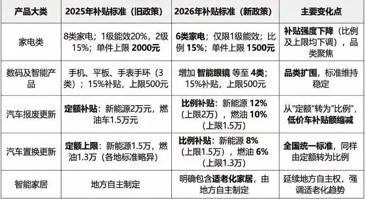 2026年“国补”政策延续并优化,重点覆盖数码智能产品、家电和汽车三大领域。数码类新增智能眼镜品类,维持15%补贴比例(单件最高500元);家电补贴仅限1级能效产品,单件补贴上限1500元;汽车补贴改为按车价比例计算,新能源车最高补2万元,燃油车最高1.5万元,同时明确旧车报废年限标准。政策同步回应民生需求,支持老旧小区电梯改造等设施升级。 新规被赞“更精准更普惠”,家电能效门槛提高引发“绿色消费”讨论,汽车补贴向新能源倾斜获好评。网友调侃“智能眼镜入列是元宇宙福利”,但也提醒警惕商家“先涨后补”。政策凸显国家促消费与环保双导向,补贴细则透明化有望减少执行乱象。
