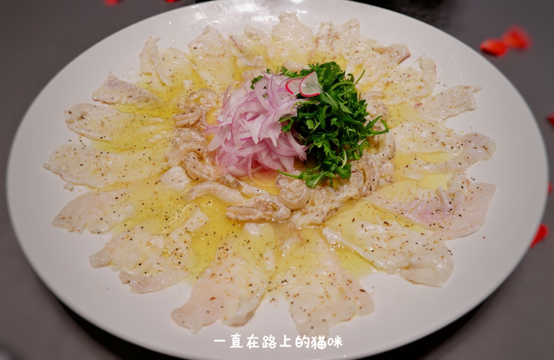 橄榄油柠檬海鲜拼:用橄榄油和柠檬汁腌制的鱼生和虾生。鱼生切成厚度适中的大片,柠檬汁不仅去腥还能激发出鱼肉的鲜,橄榄油的香气侵入鱼片中。取一片鱼在自己盘中,上面放上洋葱丝、芝麻叶等配料再卷起来一口吃掉,鱼肉的鲜,配料的清新,柠檬的微酸混合在一起美味极了。虾生比起鱼生口感更糯更甜,再配上冰镇的干白,真的美哉!