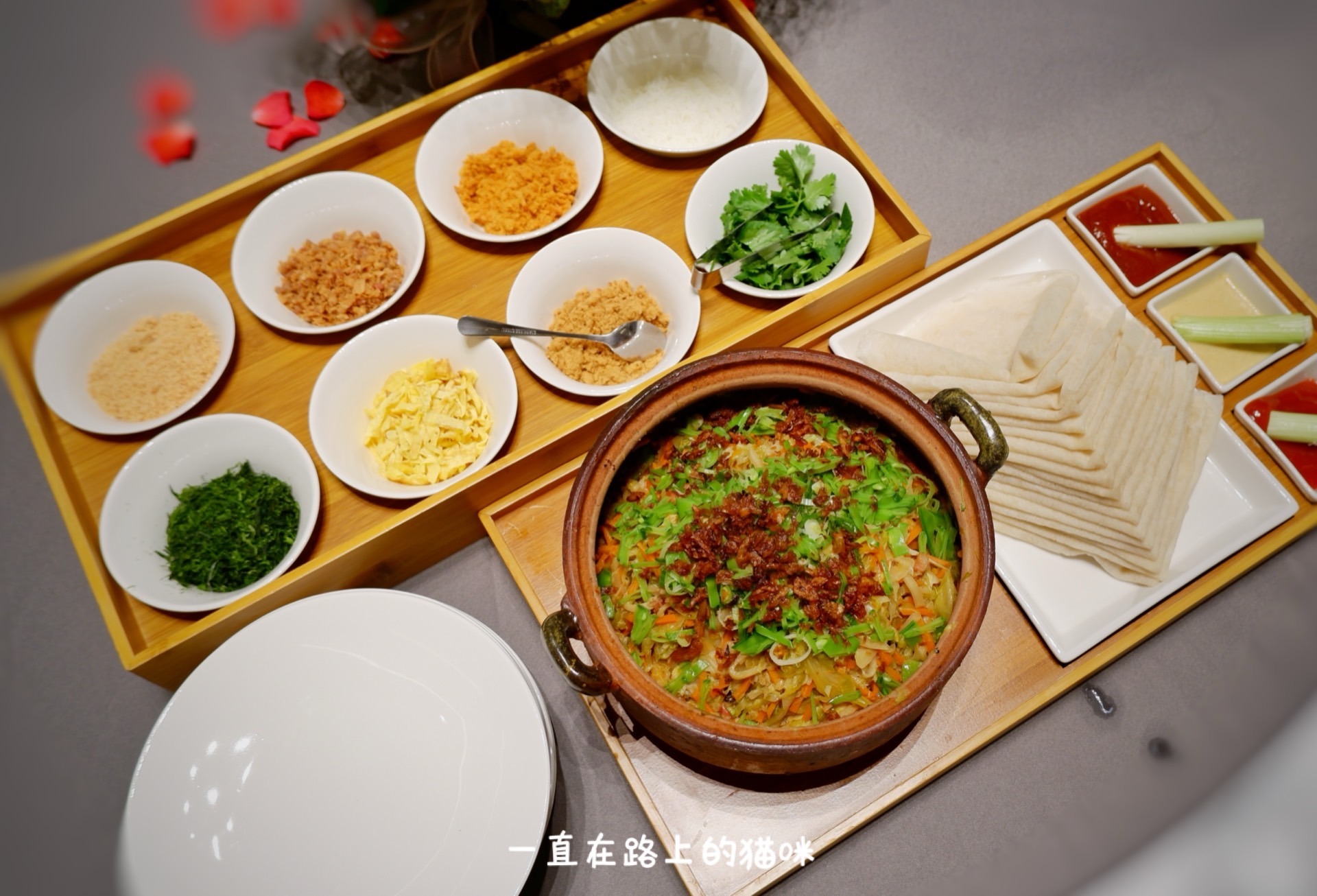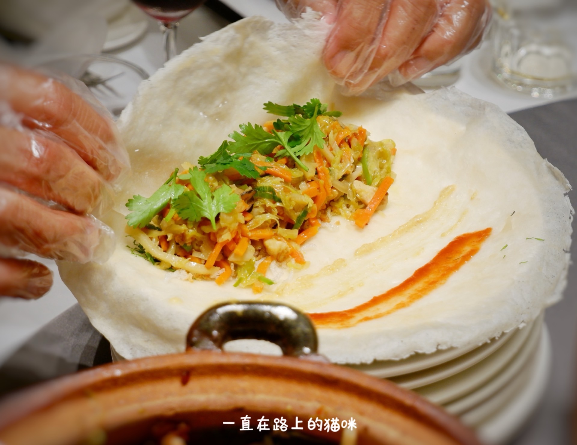 厦门薄饼:端上桌这摆盘是不是很养眼,说他是厦门最有仪式感的薄饼当之无愧。可以自己包也可以让服务员代劳。刷上三种酱,海苔、贡糖一般是必加的,其余的根据自己口味来加。馅料很是丰盛,炒的湿度恰恰好,一卷下肚十分满足。