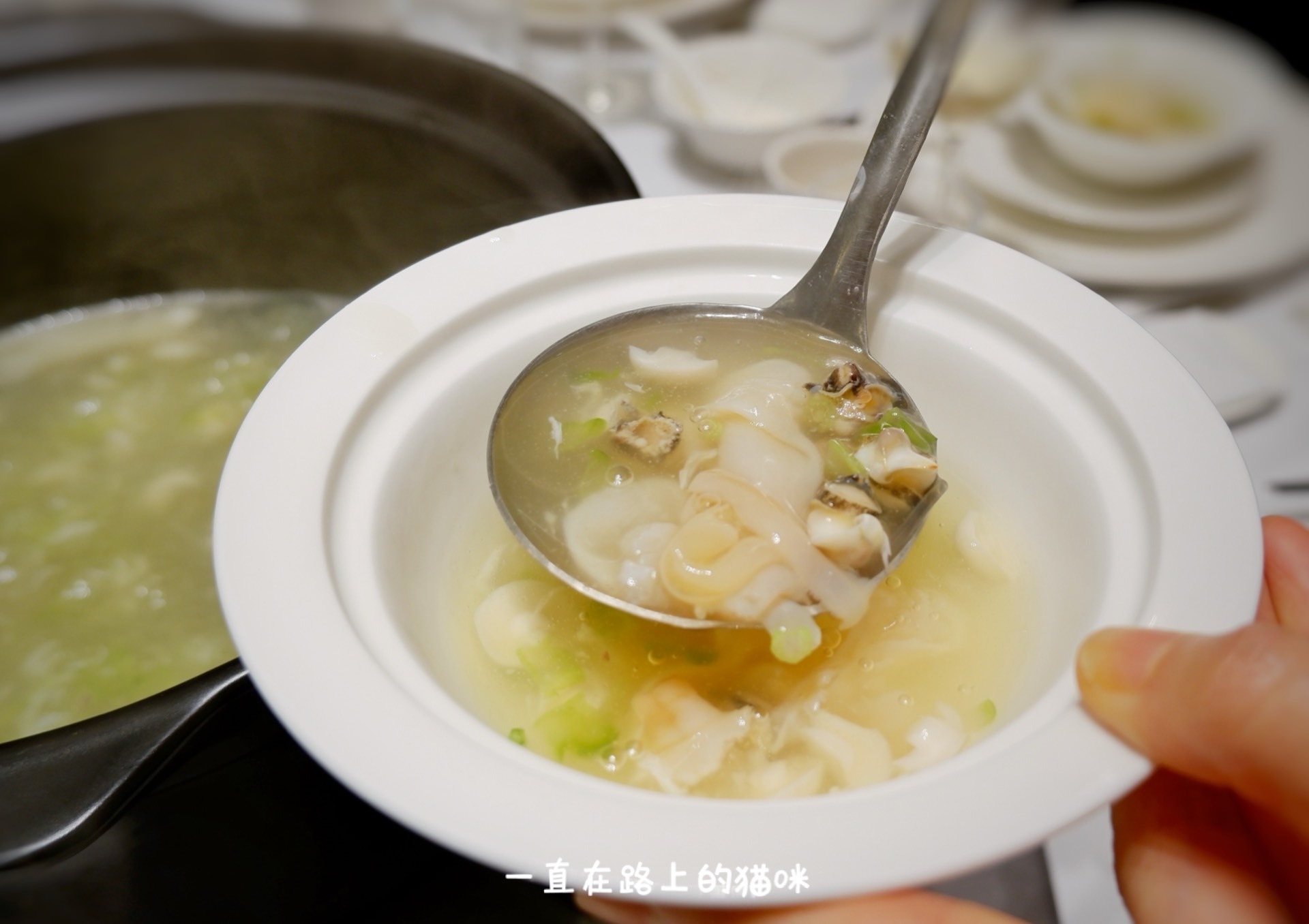 苦螺羹灼贵妃蚌:贵妃蚌装入碗中,苦螺羹上桌加热后冲入碗中,用汤羹的热度汆贵妃蚌,脆嫩爽口,汤鲜美清新。