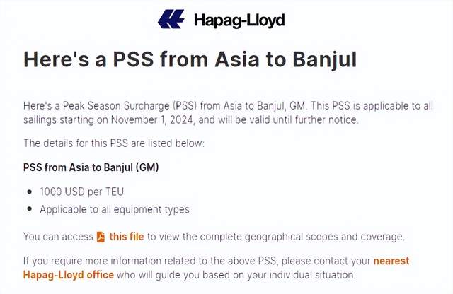 赫伯罗特宣布,自2024年11月1日起,将对从亚洲发往冈比亚Banjul的货物征收旺季附加费PSS,费率为1000美元/TEU。此附加费适用于2024年11月1日及之后的所有航班,直至另行通知。
