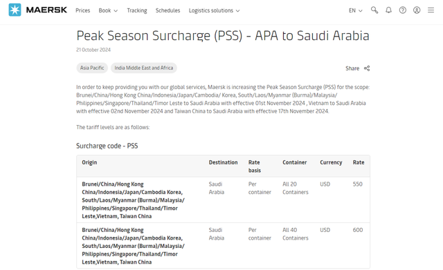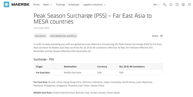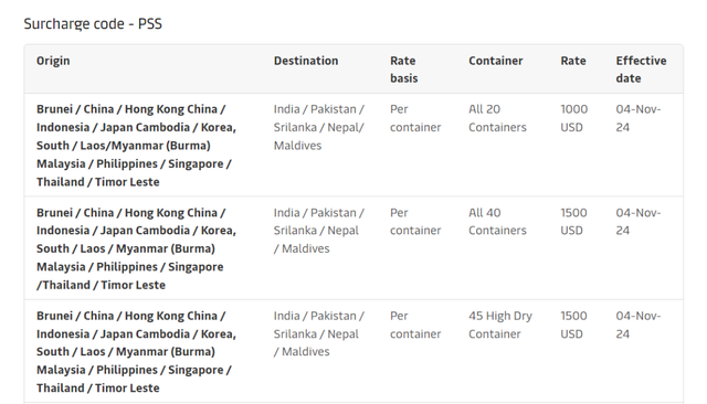 10月23日,马士基发布公告,宣布从2024年11月1日起针对远东亚洲国家至中东的征收旺季附加费PSS,每个集装箱500美元,详情如下: