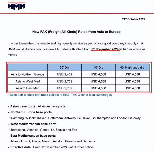 HMM发布公告,宣布新的亚洲到欧洲FAK费率,从2024年11月1日起生效,直至另行通知。详情如下: