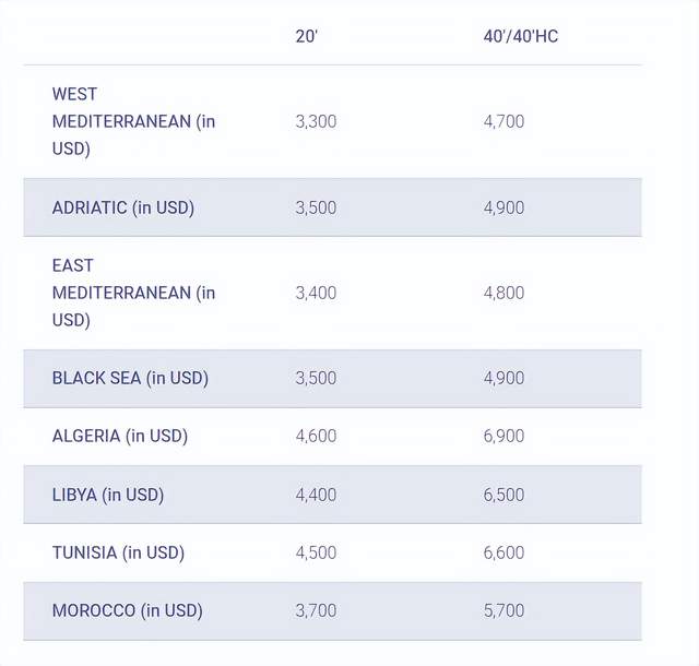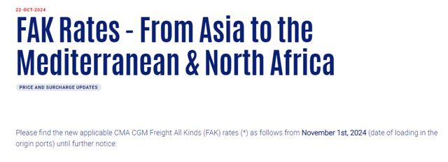 达飞发布公告,从2024年11月1日(装货日期)开始至另行通知,从亚洲到地中海和北非适用新的FAK费率,详情如下: