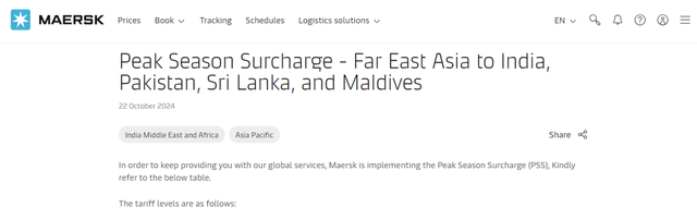 2024年11月4日起,马士基将征收远东至印度、巴基斯坦、斯里兰卡和马尔代夫等的旺季附加费PSS,详情如下: