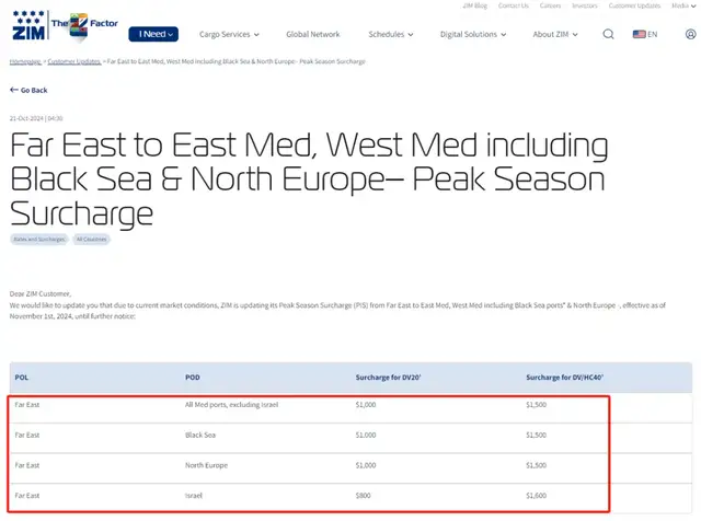 ZIM发布公告,更新其从远东到地东、地西、包括黑海港口、北欧的旺季附加费PSS,自2024年11月1日起生效,直到另行通知,详情如下: