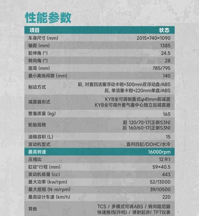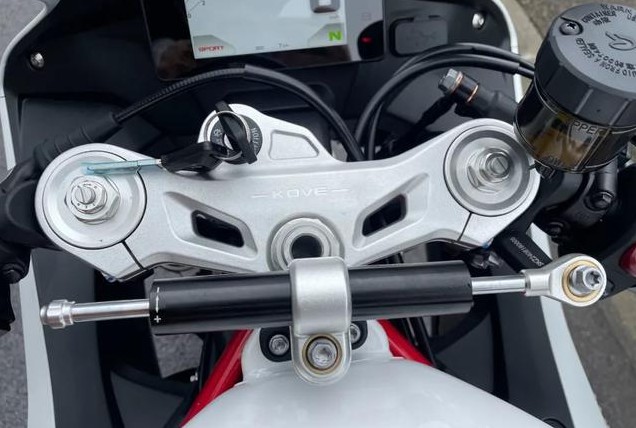 动力上这台新款350RR 赫雷兹搭载凯越自研直列双缸水冷引擎,引擎参数上实际排量344cc,最大功率35kW/11500rpm,最大扭矩32.2Nm/9000rpm,最大马力达到47.6匹。这台引擎在WSBK上摸爬滚打两年中,得力于WSBK赛事数据和调校经验以及KOVE赛事研发中心的不断优化,在国内同级也算是标杆级别的存在。