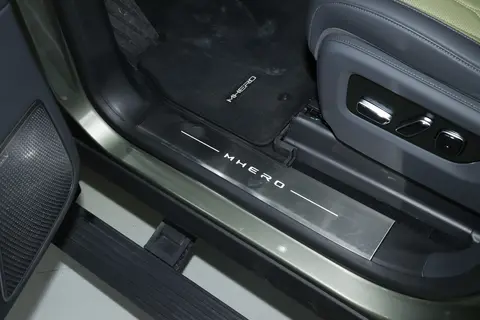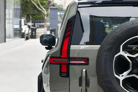 车侧狩猎之姿的雄狮仿生体态张力十足,双段式肌理设计的腰线,以及大尺寸轮包如雄狮贲张的肌肉,尽显硬派越野风范。传统造型的门把手、车顶行李架、电动侧踏板等一应俱全,既实用又美观。车尾部分,十字造型的尾灯组与前大灯相呼应,侧开式尾门和外挂式储物箱,不仅增加了车辆的实用性,还进一步提升了整车的个性。无论是在城市街道还是在野外越野,猛士M817的外观都能吸引众人的目光。车门下面的迎宾踏板也得夸一夸,这个踏板便于上下车,而且还能防刮擦,平时停车碰到马路牙子也不怕蹭到车门。脚下的轮胎是 275/60 R20 的大尺寸,看着就扎实,销售说这个轮胎公路和烂路都能应对,不用后期再换胎。车顶的行李架和可选装的背负式备胎,看着就有户外那味儿了,加上能选装的 2.5T 拖挂系统,以后带个房车、露营装备去郊外,确实很方便。