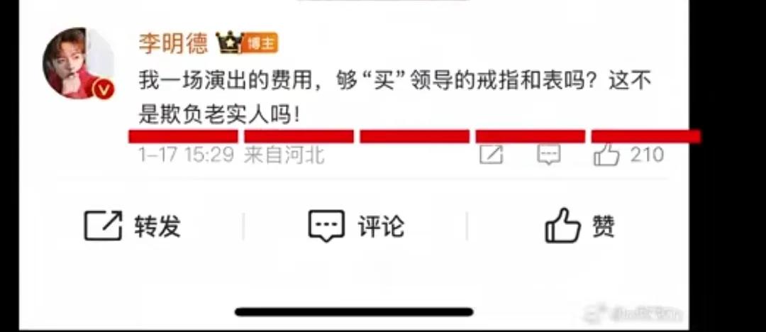 在博文的评论区,李明德进一步表达了自己的疑问:“我一场演出的收入,能否买到领导的手表和戒指?这难道不是在欺负老实人吗?”