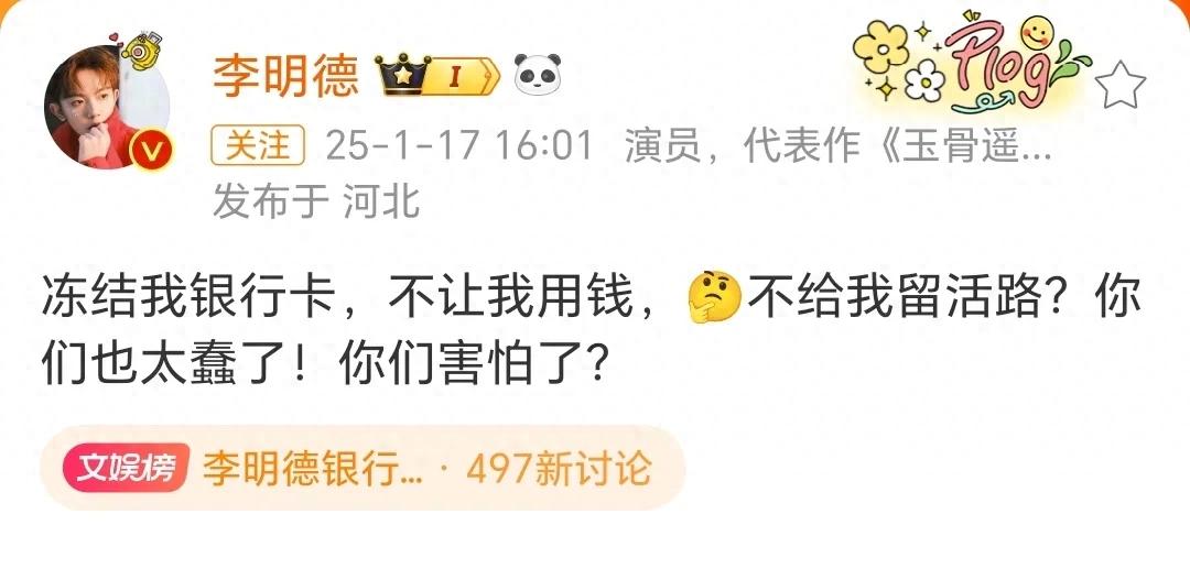 李明德情绪失控,最新博文显示:“冻结我的银行账户,剥夺我使用资金,让我无路可走,你们真是愚蠢至极,难道你们害怕了吗?”