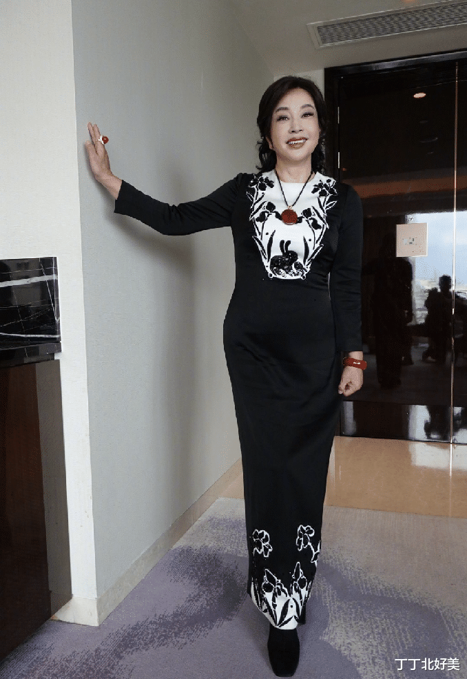 黑色的连衣裙会有一些沉闷,不过刘晓庆的这条黑色连衣裙裙却带了几份旗袍的设计,领口和裙摆处都有白色的翻样,远远看过去到多了几分沉稳,而且黑色是一个非常显瘦的颜色,这套造型把刘晓庆的身材衬托得很好,一点都不像是70多岁的人。