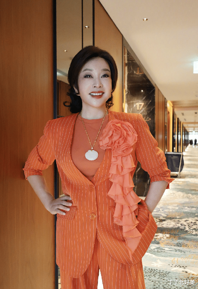 橘色是一个总充满着热情和活力的颜色,刘晓庆身上穿的这套让整个人看起来非常的年轻和欢快,比起黑色的西装来说,少了几分距离感。这件橙色的西装还是一个竖条纹的设计,能够显得人的身材更加的高挑。