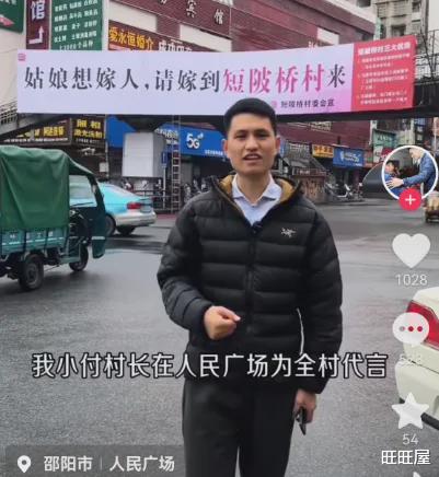 征婚广告挂好后,付曾军拍摄了一个视频发布在自己的账号上。视频中,他站在广告下说:“你在人民广场吃炸鸡,我在人民广场为全村代言,你看,姑娘想嫁人,请嫁到短陂桥村来。”