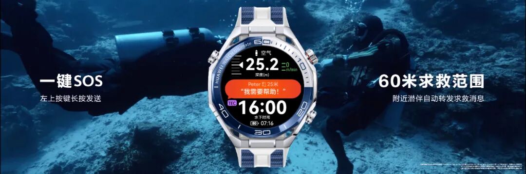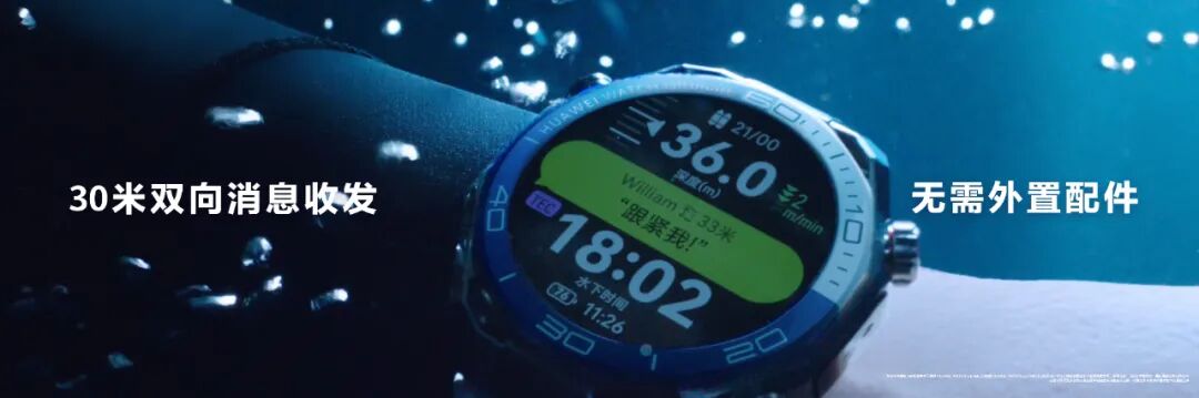 业界首款支持音频功能并达到150米潜水级防水,业界首发海豚声呐通信技术,二者组合带来深海潜水高效交流新体验。潜水时同伴可通过该功能直接传递信息,30米有效通信距离,SOS求救模式的接力转发实现最远60米的通信距离,解决了水下手势沟通受限的不便,也给潜水安全多添了一道实在保障,双重提升潜水的便捷性与安全性。前者是对智能腕表防水路径的优化,后者则将水下通讯技术推向新高度。