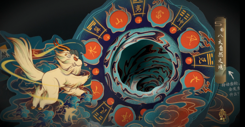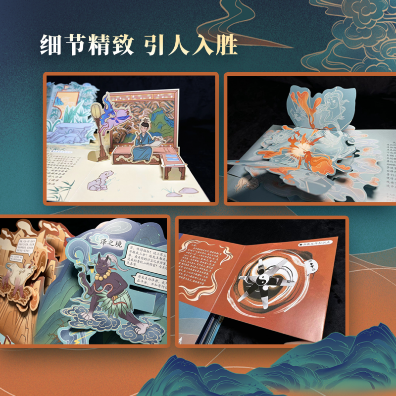盈与立体的坚实巧妙融合,8大跨页、20+立体结构、约600道工序、180度立体重现,抽拉、翻折、旋转等精巧机关穿插其间,共同打造一段奇妙玄幻的寻兽之旅。