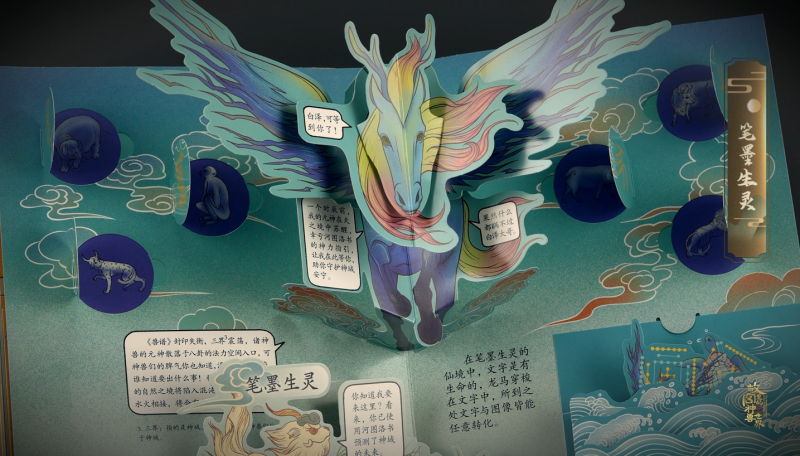 立体书中“一页一景”的精心设计,将白泽寻找神兽之旅中的八大场景立体复刻,构筑了一个多维立体的奇幻神兽宇宙。从“白泽苏醒”的神秘一刻到“自然之境”中的宁静祥和,每个场景都是一个独立的故事,每个神兽都承载着一个独特的世界。叙事环环相扣,空间纵向延伸,让孩子们在翻阅间,如同穿梭于一个个生动的历史场景,体验一场寓教于乐的知识探险。