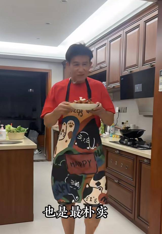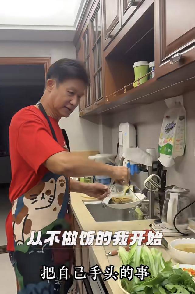 在家中李子雄穿得以舒适为主,T恤搭配短裤,身上还系着围裙,妥妥的家庭主夫的形象,虽然已经六十多岁,但是李子雄的状态相当不错,尤其是那头浓密的秀发,让人看了不禁羡慕起来,他的皮肤状态也算紧致,相信和他私下喜欢做运动有关。