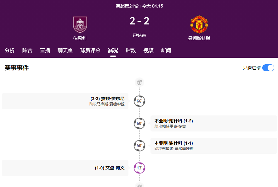 伯恩利vs曼联的比赛在特夫摩尔球场打响!上半场,汉弗莱斯传中,海文不慎自摆乌龙;库尼亚头球被汉弗莱斯门线解围;利桑德罗破门被吹无效!下半场,B费助攻舍什科扳平比分,多尔古再助舍什科完成双响!杰顿·安东尼兜射破门;18岁小将莱西兜射中横梁!最终,曼联2-2战平伯恩利,面对保级球队,换帅也没能带来胜利!