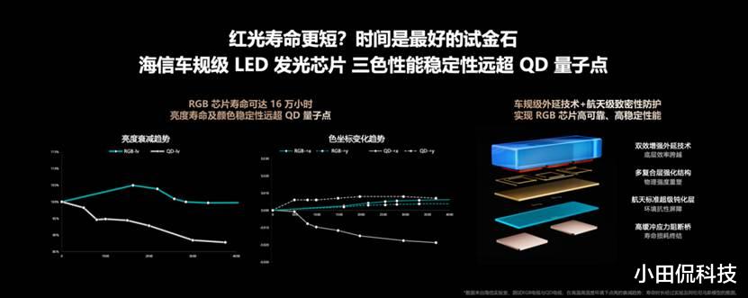RGB-Mini LED的核心优势的在于无机晶体材料的天生稳定性——采用无机晶体芯片,搭配车规级工艺与航天级钝化层防护,能有效隔绝外界腐蚀,耐受高负荷工作。经测试,在85℃高温、60mA大电流的极端环境下,其寿命可突破16万小时,正常使用超十年仍能保持不褪色、不衰减,耐用性远超依赖量子点材料的SQD方案。