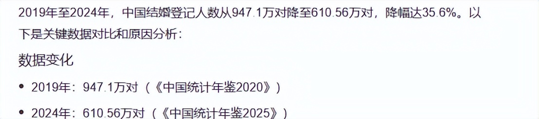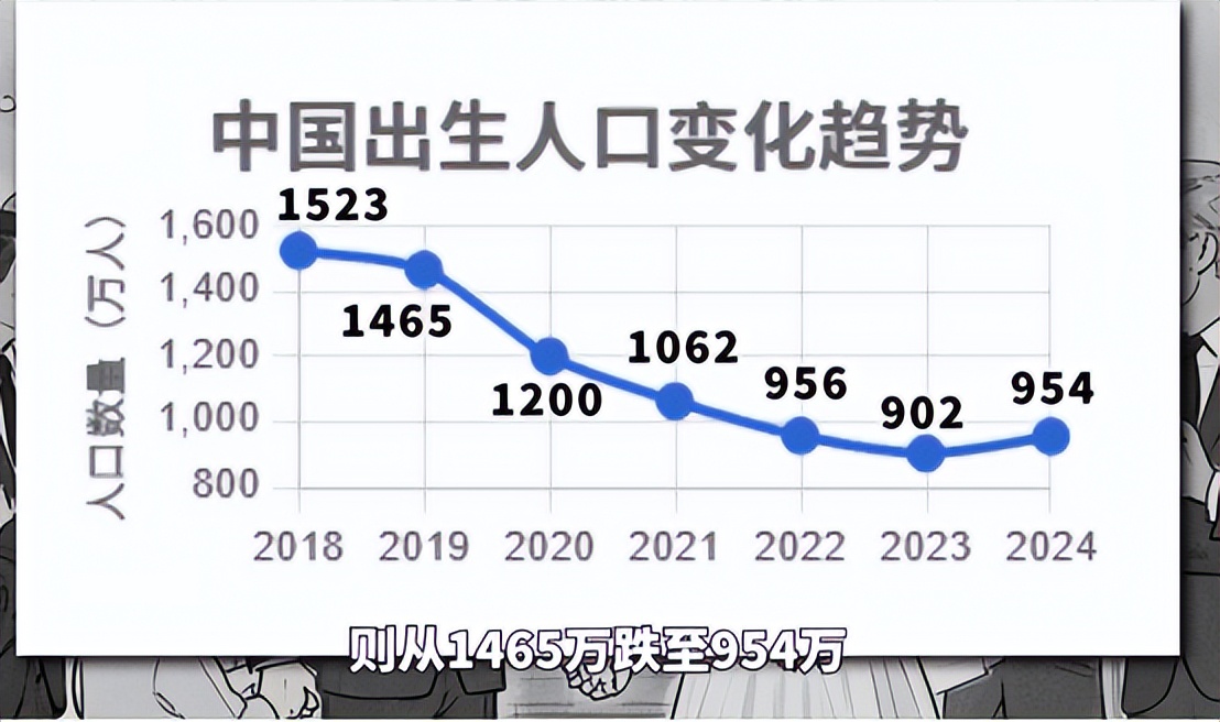 从2019年到2024年,去民政局领结婚证的人从947万对降到了610万对,而每年出生的新孩子,也从1465万减少到了954万。