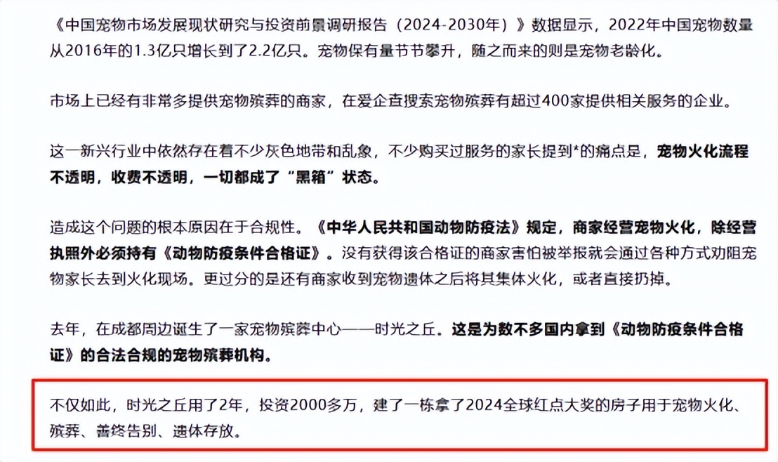 2023年成都有个叫时光之秋的宠物殡葬中心建成,花了两年时间,投了2000多万。