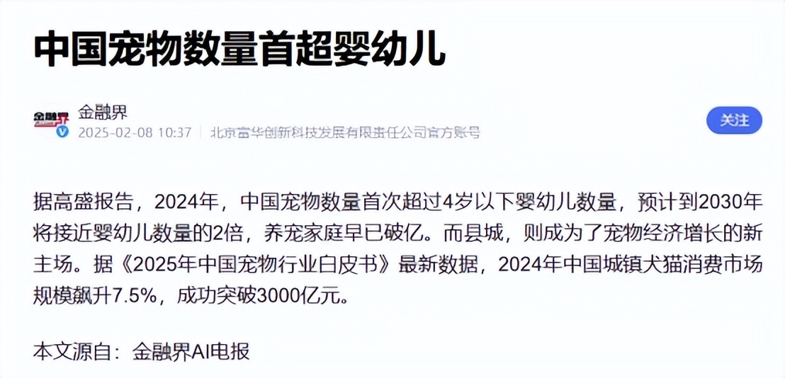 高盛公司的一份报告里说,在2024年,中国宠物的总数量已经超过了4岁以下小孩的数量,他们还估计,到2030年,宠物的数量会是小孩的两倍。