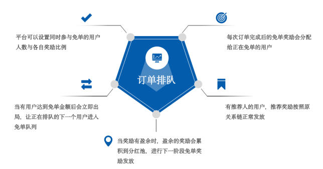 消费者在合作商户消费后,通过商户提供的小程序、APP 或线下登记方式确认订单,自动进入排队队列;平台通常会按每日营收的一定比例设立 “免单资金池”,每日抽取固定数量或比例的排队用户进行免单返还,用户可实时查看排队进度,免单金额直接原路退回或转为平台余额。用户也可选择中途退出,则一次性返还当前免单金额60%(比例自定义)的购物币,用于线上/线下消费抵扣。