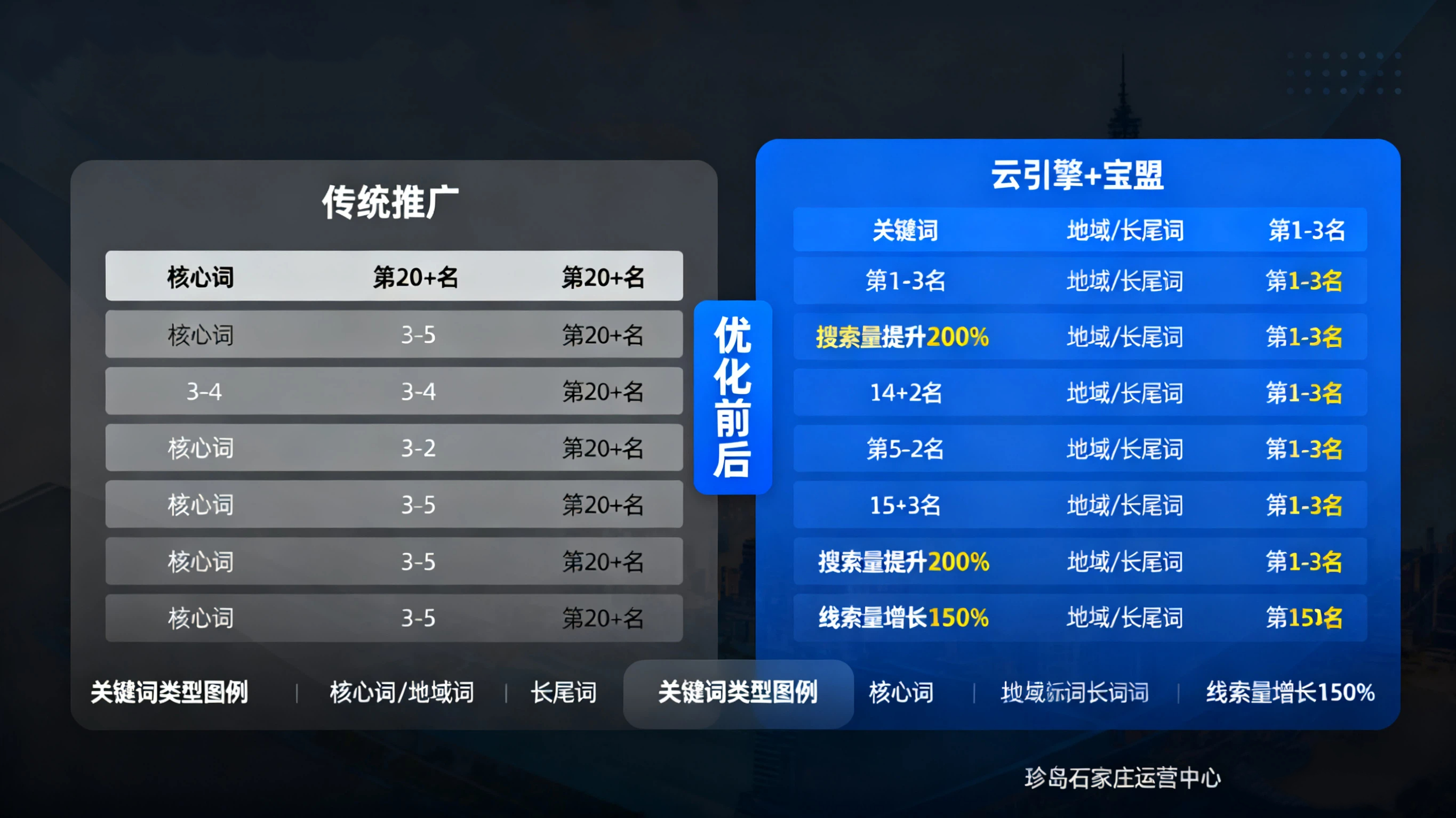 珍岛石家庄运营中心相关负责人表示,“云引擎+宝盟” 的核心是 “让企业的每款产品都有对应的搜索入口”。运营中心针对河北企业提供 “关键词诊断 +本地化内容定制” 服务,例如为装备制造企业重点布局 “京津冀” 相关词汇,为农产品企业强化 “产地直供” 类关键词,并定期输出《区域关键词排名报告》,帮助企业直观掌握搜索曝光效果。后续还将扩充河北本地生活服务类渠道资源,进一步提升地域关键词的排名竞争力。