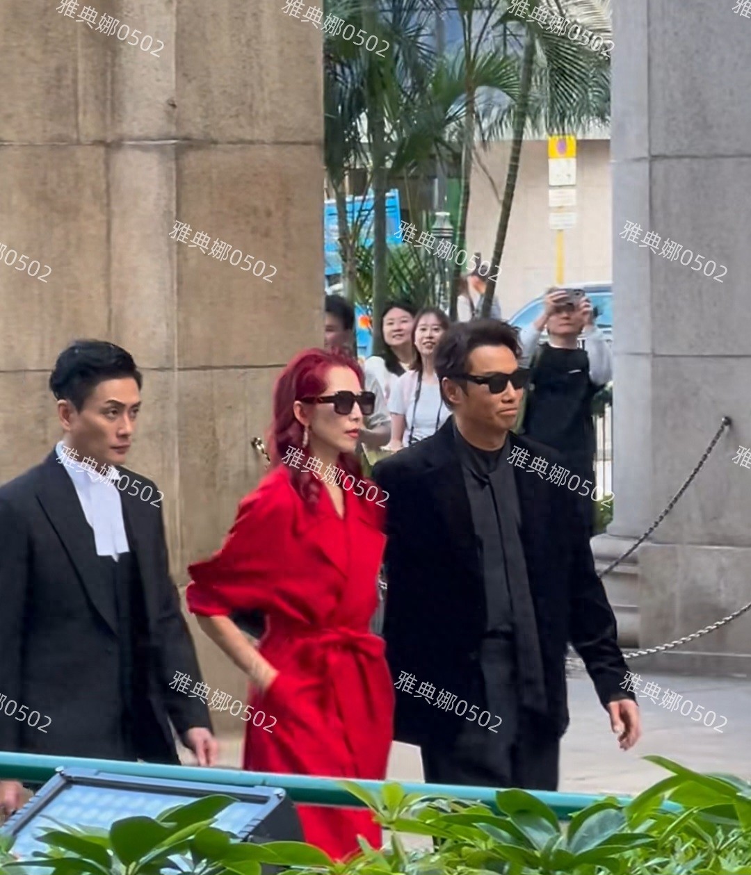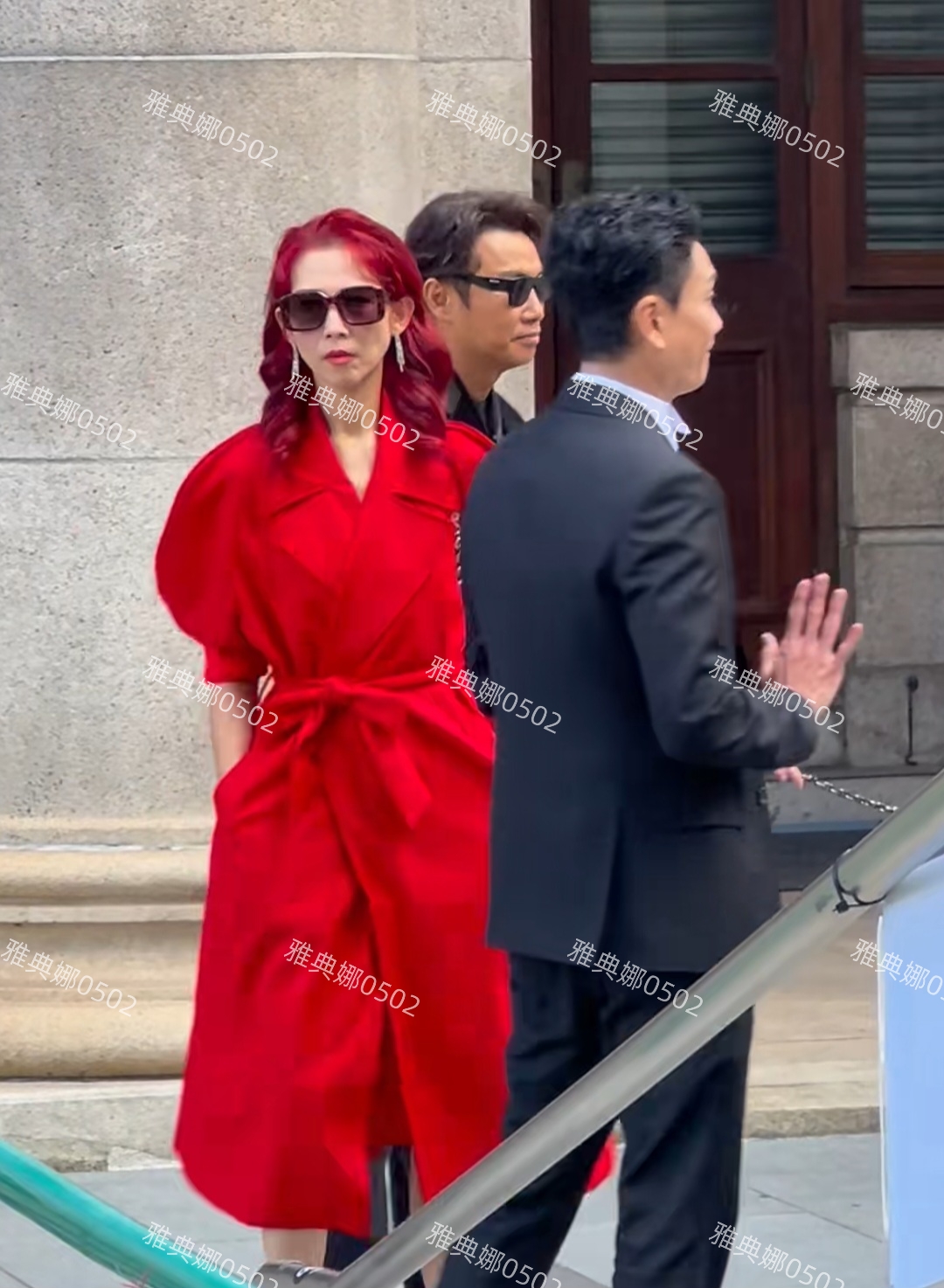 先是拍蔡少芬黄宗泽和谭耀文的戏,蔡少芬跟两位身高1米8的男演员走在一起三人几乎一样高,蔡少芬穿着大红色的风衣染着大红色的头发戴着墨镜气场全开女王范儿十足。