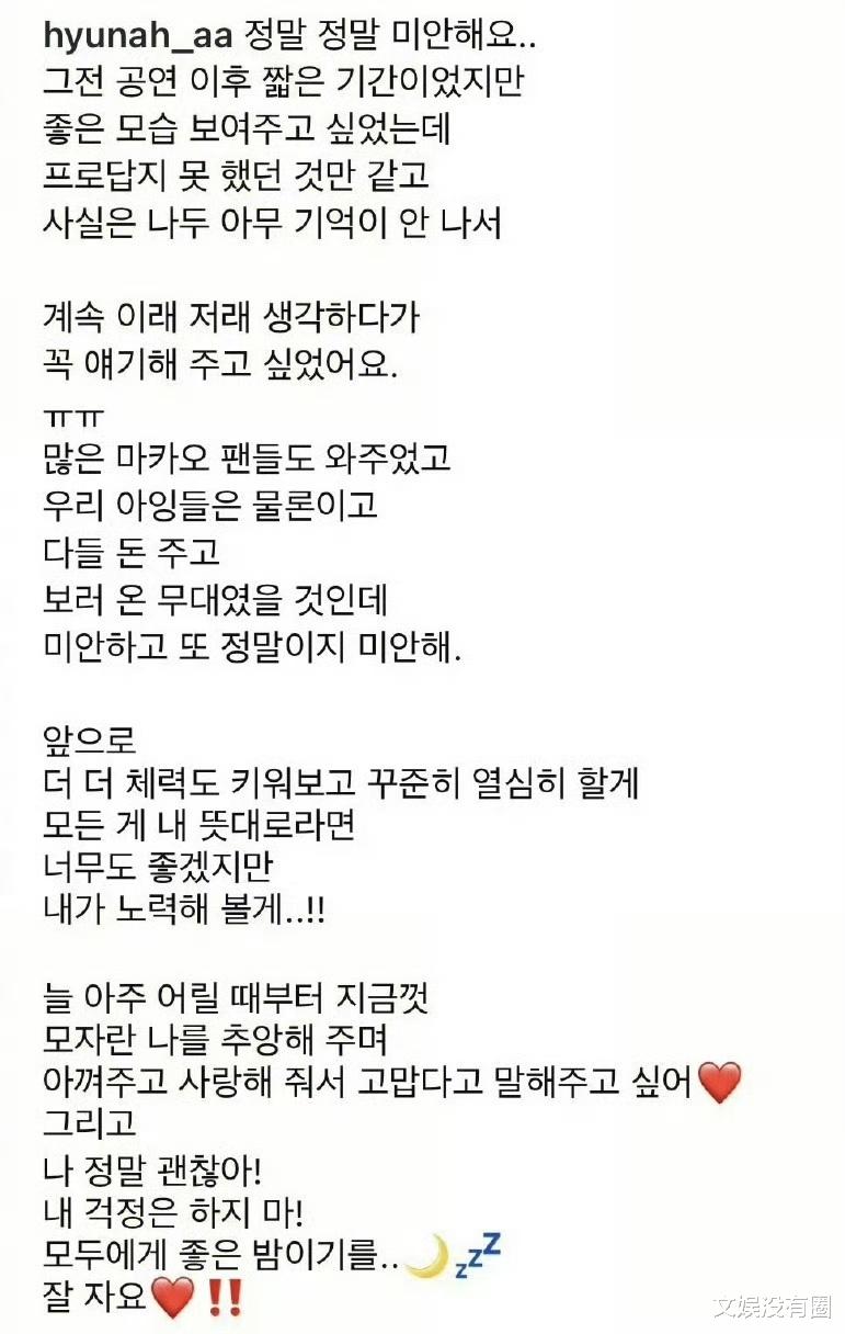就在晕倒后的当晚,泫雅就在Instagram上发布了长文,开口第一句就是满是歉意的“对不起”!她自责地表示:“本想展现最完美的舞台,却因为自己中断了演出…感觉真不像个专业人士。” 字里行间满是愧疚,还特别点名了澳门粉丝和官方后援会“AING”,并再次道歉道:“大家花钱来看我,我却没能完成表演…” 这番诚意满满的道歉让全球粉丝都心疼不已!