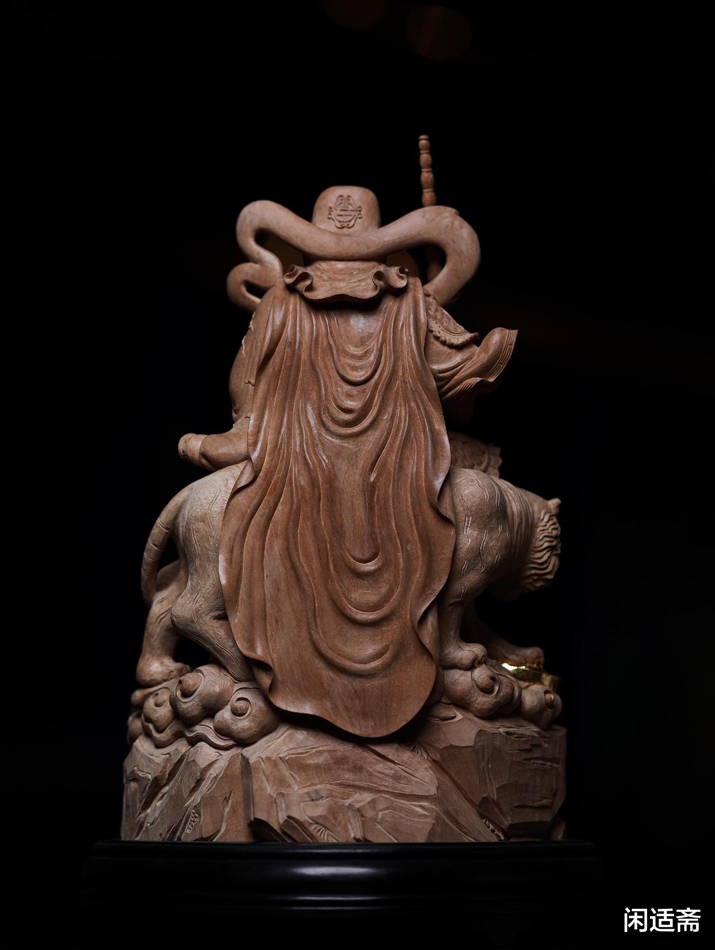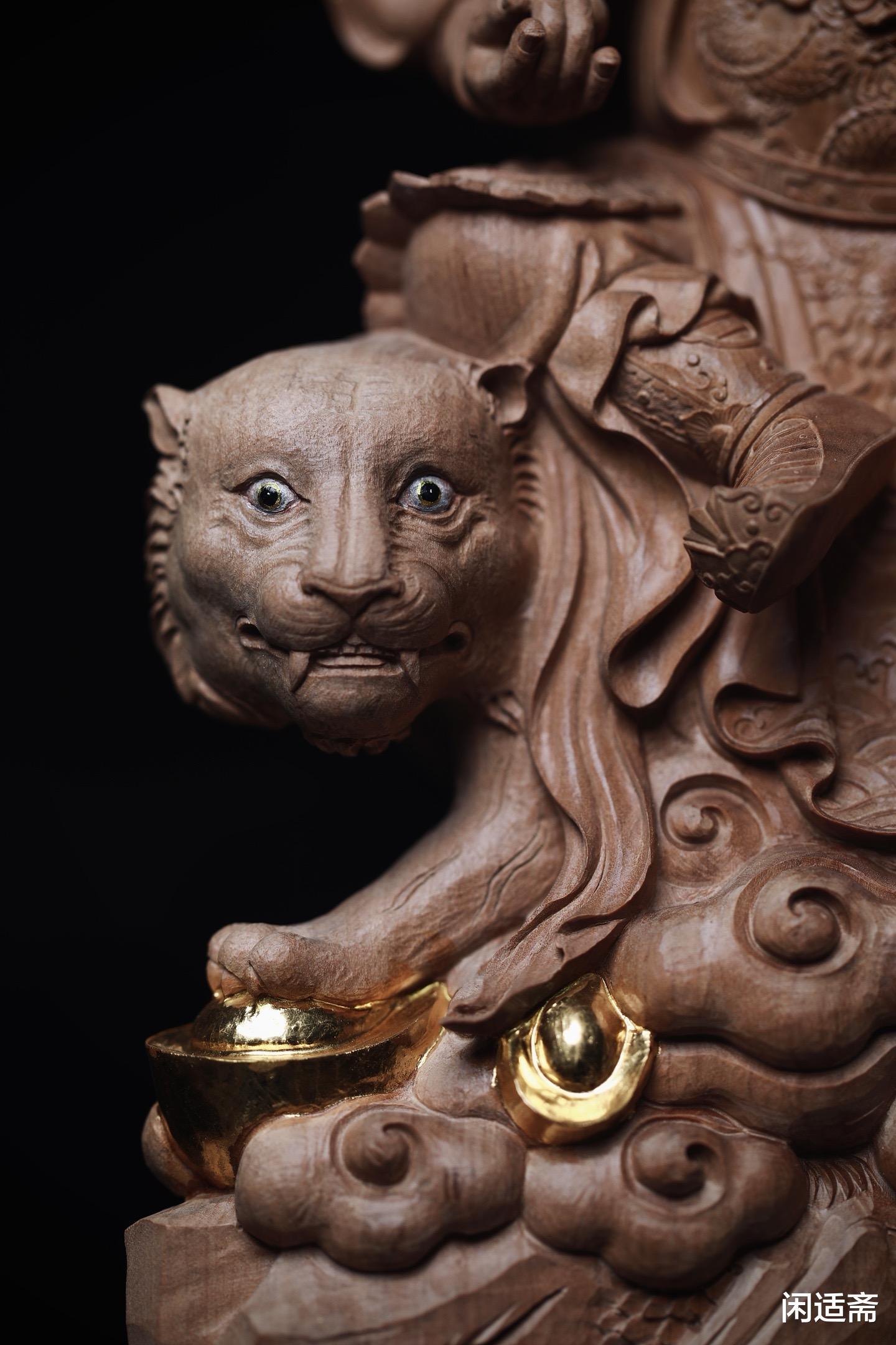 身着金甲皂袍的戎装造型,完美诠释了“正一玄坛元帅”的威严气度:外披的朝袍垂坠自然,衣纹疏朗流畅,顺着身体姿态形成自然堆叠,匠人通过深浅不一的雕刻技法,让衣料的轻薄与厚重感清晰区分,为威严造型增添了几分精致。右手紧握铁鞭,鞭身雕刻出螺旋状纹路,线条遒劲有力,象征着执掌财富的权威;左手托起贴金元宝,寓意财富象征。黑虎坐骑姿态矫健,虎目圆睁、獠牙微露,四肢肌肉线条饱满,仿佛随时准备腾跃而起,与赵公明的神威形成呼应,更暗合“骑虎聚财”的民间寓意。